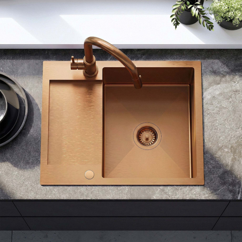 Oceľový drez Paul v prevedení brúsená meď spája moderný dizajn a praktickosť, vďaka čomu sa skvele hodí do každej kuchyne. Je vyrobený z vysoko kvalitnej nerezovej ocele AISI 304 (hrúbka 2 mm) a vyniká vysokou odolnosťou proti korózii, poškriabaniu aj vysokým teplotám, takže zostáva dlhodobo odolný a spoľahlivý. Hlboká, priestranná vaňa zaisťuje pohodlie pri každodennom používaní. Drez je vybavený otvorom pre batériu, čo umožňuje rýchlu a jednoduchú montáž armatúry. Produkt má odtok farebne zladený s povrchovou úpravou, vďaka čomu celok pôsobí jednotne a elegantne. Hygienický povrch a ľahké čistenie hladkých prvkov pomáhajú udržať drez v bezchybnom stave a obmedzujú možnosť rozvoja mikroorganizmov. Produkt je dostupný v dvoch variantoch: bez batérie alebo v sete s kuchynskou batériou Fresh s.