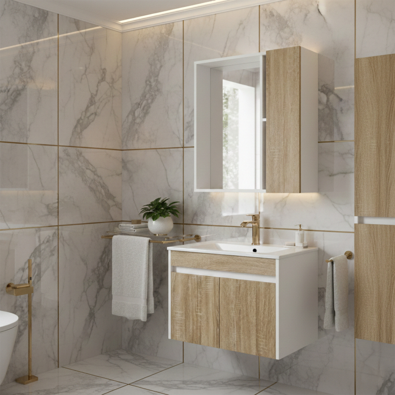 Kúpeľňová zostava Faro 60 cm je hotový komplet na vytvorenie funkčnej umývadlovej zóny v modernej kúpeľni. Sada obsahuje spodnú skrinku, hornú skrinku so zrkadlom a zladené keramické umývadlo. Spája praktické usporiadanie s estetikou inšpirovanou prirodzenou kresbou dreva. Obsah sady – v balení je spodná skrinka, horná skrinka so zrkadlom a keramické umývadlo určené na montáž na spodnú skrinku. Batéria zobrazená na vizualizácii je iba ilustratívna a nie je súčasťou sady (je nutné ju dokúpiť zvlášť). Materiál - nábytok je vyrobený prevažne z MDF. Čelá majú dekor v odtieni dreva, zatiaľ čo boky sú v bielej farbe, čo vytvára univerzálne a vizuálne ľahké spojenie. Keramické umývadlo - sada obsahuje keramické umývadlo prispôsobené spodnej skrinke. Je pripravené na každodenné používanie, ľahko sa udržuje v čistote a je praktické v umývadlovej zóne. Čelá v dekore dreva – prirodzene pôsobiace čelá zatepľujú vzhľad kúpeľne a dobre ladia ako s modernými, tak aj s klasickejšími doplnkami. Horná skrinka s dvojitou zrkadlovou zónou – vo vnútri skrinky je zrkadlo a po otvorení dvierok získate aj ďalšiu zrkadlovú plochu z vnútornej strany, čo zvyšuje komfort pri každodennom používaní. Kompaktná šírka 60 cm – zostava je vhodná do menších aj stredne veľkých kúpeľní, ponúka pohodlný úložný priestor a upratané miesto pri umývadle. Zostava Faro 60 cm je praktická voľba pre tých, ktorí hľadajú kompletné riešenie do kúpeľne. Kombinácia MDF, keramického umývadla a čiel v dekore dreva vytvára estetický, funkčný a každodenne pohodlný celok.