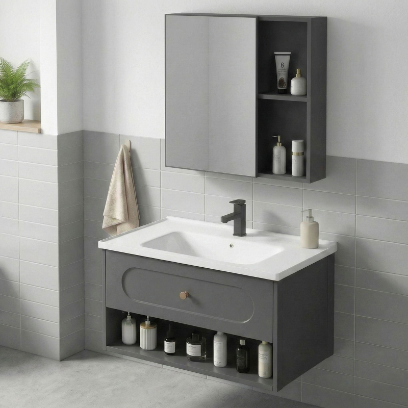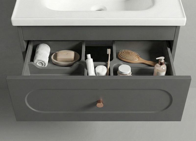 Kúpeľňová zostava nábytku River je kompletné riešenie navrhnuté na funkčné usporiadanie umývadlovej zóny. Zostava zahŕňa tri prvky: závesnú skrinku pod umývadlo, dedikované keramické umývadlo a hornú skrinku so zrkadlom. Celok tvorí závesný systém pripravený na montáž. Skrinka pod umývadlo – závesný modul ponúkajúci praktický úložný priestor. Je vybavený zásuvkou s vnútorným organizérom a otvorenou spodnou policou na doplnky. Korpus je vyrobený z ľahkého plastu.Keramické umývadlo - zapustený model, ideálne prispôsobený rozmerom skrinky. Má štandardný montážny otvor, určený pre inštaláciu stojankovej batérie. Skrinka so zrkadlom – závesný prvok, ktorý spája funkciu zrkadla s ďalším miestom na kozmetiku vďaka policam. Konštrukcia a materiál – zostava kombinuje klasické keramické umývadlo s nábytkovými korpusmi z plastu, čo zaisťuje nízku hmotnosť jednotlivých častí. čo uľahčuje prístup k podlahe pod nábytkom. Zostava River je návrh pre osoby hľadajúce hotové a jednoduché riešenia. Kombinácia plastových skriniek s keramickým umývadlom vytvára ľahkú konštrukciu, ktorá poskytuje potrebnú funkčnosť a úložný priestor v kúpeľni.