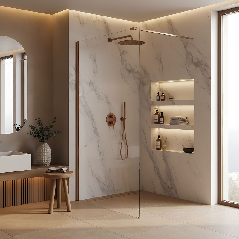 Snívate o kúpeľni plnej tepla a luxusu? Objavte sprchovú zástenu walk-in Rea Flexi v zaujímavej konfigurácii: transparentné sklo a profil vo farbe kartáčovanej medi. Toto spojenie modernej formy a elegantného prevedenia dodáva interiéru jedinečný charakter. Konštrukcia z bezpečného 8mm tvrdeného skla zaisťuje dlhú životnosť a stabilitu. Tvrdené sklo 8 mm – silné, bezpečné transparentné sklo, ktoré vizuálne nenarušuje priestor. Hliníkový profil v kartáčovanej medi – luxusný kartáčovaný povrch profilu a stabilizačného ramena, ktorý sa skvele dopĺňa s čírym sklom vrstva uľahčujúca stekaniu vody a chrániaca pred usadeninami mydla a vodného kameňa. Stabilizačné rameno 120 cm s možnosťou skrátenia – horné rameno v medenej farbe je možné upraviť podľa individuálnych potrieb. maximálne pohodlie a spoľahlivosť.Sprchová zástena Rea Flexi je ideálnou voľbou pre tých, ktorí hľadajú vycibrený štýl. Vďaka povrchu Easy Clean a kvalitným materiálom spája výrobok vysokú estetiku s každodennou funkčnosťou.