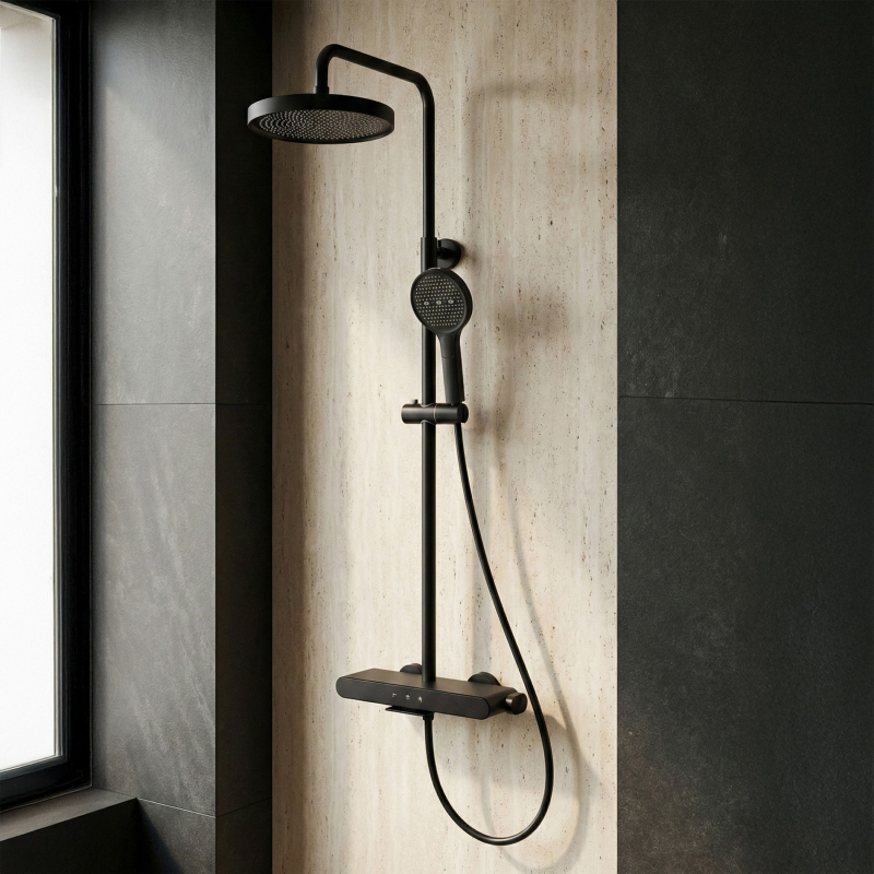 Objavte nový štandard sprchovania vďaka nástennej sprchovej súprave Rea Farel Black. Tento model je esenciou moderného designu, ktorý spája eleganciu čiernej armatúry s inovatívnou funkčnosťou. Namiesto bežných riešení ponúka Farel pohodlné tlačidlové ovládanie a unikátne prvky, ktoré uľahčujú udržanie čistoty v kúpeľni. Intuitívny panel Piano – srdcom súpravy je batéria vybavená systémom estetických tlačidiel. Tie umožňujú rýchle a pohodlné prepínanie prúdu vody medzi hlavovou sprchou, ručnou sprchou a výtokom. Ručná sprcha s funkciou Bidetta - revolučné riešenie v oblasti sprchových armatúr. Ručná sprcha má tlačidlo na zadnej strane tela a dodatočný vývod hore. Po aktivácii sa zmení na bidetovú spršku, ideálnu pre rýchle opláchnutie kabíny, umytie vaničky alebo naplnenie vysokého vedra. Diskrétny kaskádový výtok - batéria má tiež integrovaný vaňový výtok. Široký kaskádový prúd umožňuje pohodlne umyť ruky alebo naplniť misku bez použitia ručnej sprchy. Technológia Electroplating – hlboká matná čierna bola dosiahnutá galvanickým procesom. Vďaka tomu je povrch dokonale hladký, odolný a výrazne odolnejší voči mechanickému poškodeniu a vlhkosti ako tradičné práškové lakovanie. Pevná konštrukcia – telo batérie je vyrobené z odolnej mosadze, čo zaručuje stabilitu a spoľahlivosť po mnoho rokov. Hlavová aj ručná sprcha z ABS zaisťujú ľahkosť a ľahké čistenie trysiek od vodného kameňa. Komfort používania – súprava je vybavená výškovo nastaviteľnou tyčou, ktorá umožňuje ideálne prispôsobiť hlavovú sprchu výške každého člena domácnosti aj rozmerom sprchovacieho kúta. Súprava Rea Farel Black je ideálnou voľbou do moderných kúpeľní v štýle. Jej premyslená konštrukcia zjednodušuje každodenné rituály.