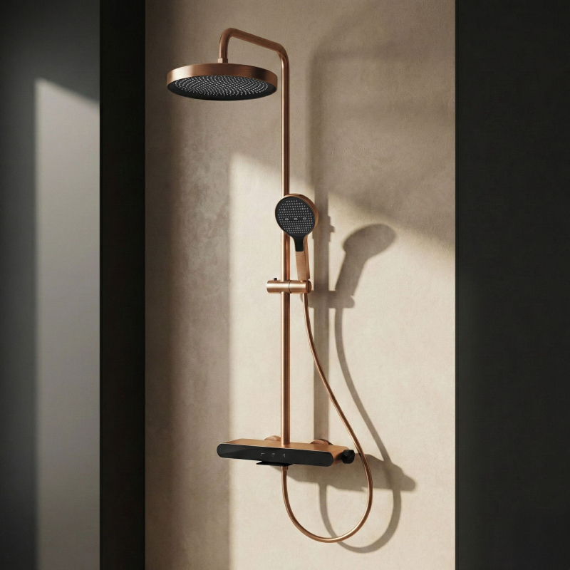 Dodajte svojej kúpeľni výnimočný, hrejivý charakter vďaka nástennému sprchovému setu Rea Farel Brush Copper. Tento model v prevedení kartáčovaná meď je určený pre tých, ktorí hľadajú alternatívu k zlatu a čiernej. Set kombinuje ušľachtilý kovový dizajn s inovatívnou funkčnosťou ovládania a udržiavania čistoty. Farba Brush Copper - elegantný medený odtieň s jemne kartáčovanou štruktúrou. Saténová povrchová úprava pôsobí moderne a zároveň je praktická – na kartáčovanom povrchu sú kvapky vody a odtlačky prstov výrazne menej viditeľné. PVD povlak – medená farba bola nanesená technológiou PVD (Physical Vapor Deposition). Ide o najodolnejšiu metódu farbenia armatúry, ktorá zaručuje mimoriadnu odolnosť voči poškriabaniu, zmatneniu a korózii. Intuitívny panel Piano – batéria sa ovláda pomocou troch mechanických tlačidiel (kláves). Toto pohodlné riešenie umožňuje bleskovo prepínať prúd vody medzi hlavovou sprchou, ručnou sprchou a výtokom bez nutnosti otáčania ovládačov. Ručná sprcha s funkciou Bidetta – rukoväť sprchy skrýva ďalšiu funkciu. Má tlačidlo na zadnej strane a trysku na hornej časti tela. Po aktivácii sa zmení na bidetovú spršku, čo uľahčuje čistenie kabíny, umývanie vaničky či napúšťanie vysokých misiek. Diskrétny kaskádový výtok – telo batérie je vybavené širokým kaskádovým výtokom. Umožňuje rýchle naplnenie vedra, misky alebo kontrolu teploty vody priamo pri batérii. Materiály a regulácia – srdcom setu je pevné telo z mosadze. Hlavová aj ručná sprcha z ľahkého ABS majú systém proti usadzovaniu vodného kameňa. Celok je upevnený na výškovo nastaviteľnej tyči. Set Rea Farel Brushed Copper predstavuje spojenie technologickej presnosti a jedinečného dizajnu. Kartáčovaný medený PVD povrch je výrazným akcentom interiéru a robí z neho jeden z najodolnejších setov na trhu, pripravený na každodenné používanie.