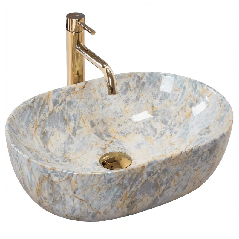 Zvoľte umývadlo na dosku Rea Amelia 48 Ruststone, pokiaľ hľadáte keramiku s netypickou povrchovou úpravou. Tento model kombinuje klasický oválny tvar s povrchom imitujúcim prírodný kameň. Je vyrobené z odolnej sanitárnej keramiky a predstavuje funkčný aj estetický prvok vybavenia kúpeľne. Vzor Ruststone – glazúra umývadla je pokrytá viacfarebným dekorom, v ktorom sú chladné odtiene modrej a šedej preťaté hrdzavými, medenými žilkami. Celok pripomína štruktúru prírodného minerálu. Lesklý povrch – dokonale hladká, lesklá úprava zvýrazňuje intenzitu farieb. Je tiež praktická, pretože uľahčuje každodenné čistenie a obmedzuje usadzovanie nečistôt. Oválny tvar – jednoduchá, zaoblená misa je univerzálna a ergonomická, zaisťuje pohodlné používanie bez rozstrekovania vody. Sanitárna keramika – materiál sa vyznačuje vysokou odolnosťou a rezistenciou voči poškriabaniu i poškodeniu, čo zaručuje dlhú životnosť produktu. dosku alebo skrinku, takže jeho dekoratívny povrch je dobre viditeľný zo všetkých strán. Umývadlo Rea Amelia 48 Ruststone je riešenie pre interiéry, ktoré potrebujú oživiť. Jeho kamenný dekór a lesklý povrch sa odlišujú od jednoliatej armatúry a pritom zachovávajú plnú praktickosť.