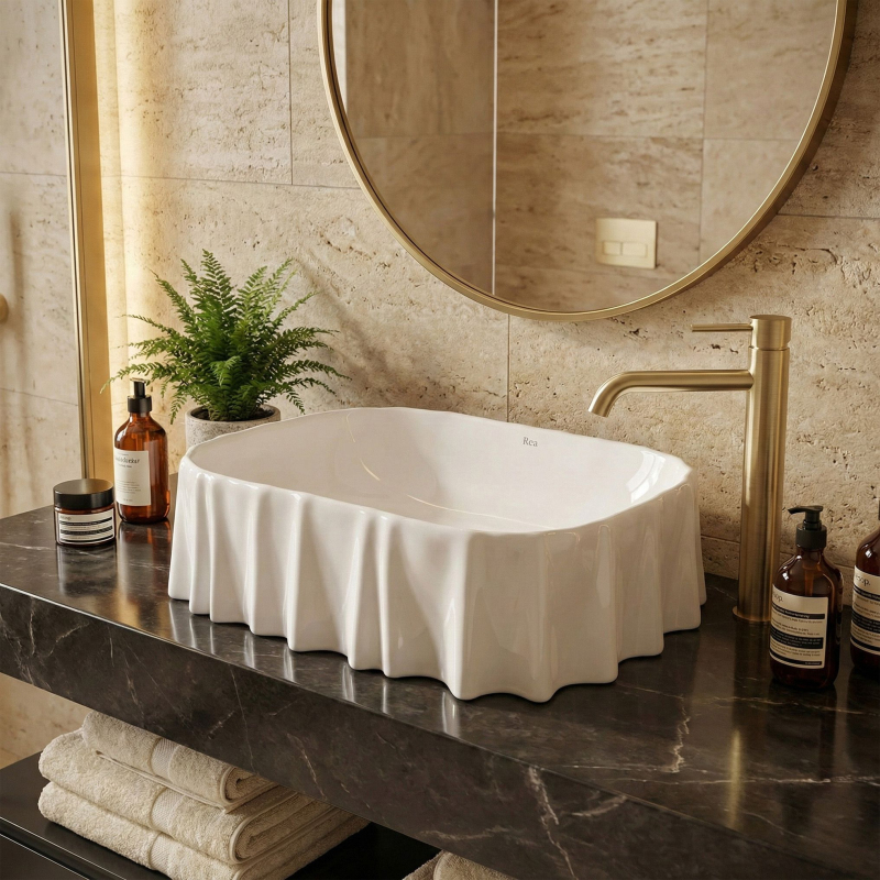 Hľadáte výnimočný detail, ktorý oživí interiér kúpeľne? Biele umývadlo na dosku REA Atria predstavuje nevšedný dizajn evokujúci jemne zvlnenú látku, ktorý priťahuje pozornosť a dodáva priestoru vizuálnu ľahkosť. Použitie špičkovej sanitárnej keramiky zaručuje bezchybný vzhľad po dlhé roky aj mimoriadnu odolnosť. Montáž na dosku - umožňuje efektívne vyniknúť netradičnému tvaru misy a zároveň šetrí cenné miesto v skrinke pod ňou. Vysoko kvalitná sanitárna keramika – vykazuje nadpriemernú odolnosť proti poškriabaniu a zmene farby, čo zaisťuje rýchlu a jednoduchú každodennú údržbu. Neštandardný zvlnený okraj – unikátny prvok, ktorý premieňa bežný produkt na skutočné umelecké dielo, udávajúce nezameniteľný charakter interiéru. Snehovo biely lesk – spoľahlivo presvetlí priestor, zatiaľ čo dokonale hladký povrch bráni usadzovaniu odolného vodného kameňa a nečistôt. Premyslené rozmery a hĺbka 120 mm - zamedzujú nepríjemnému rozstrekovaniu vody, čím poskytujú maximálny komfort počas rannej hygieny. Absencia otvoru pre batériu a prepadu – ponúka absolútnu slobodu pri výbere ideálnej nástennej alebo vysokej stojankovej batérie, a uľahčuje tak realizáciu individuálnych architektonických vízií. Výberom umývadla na dosku REA Atria je získaný nielen vysoko praktický prvok vybavenia, ale aj veľkolepá ozdoba celej miestnosti. Jeho originálny vzhľad zjednodušuje voľbu doplnkových armatúr, čím je zaručený ucelený a luxusný výsledný dojem. Bezproblémová inštalácia a nekompromisný dôraz výrobcu na detail tvoria istotu spoľahlivej investície.