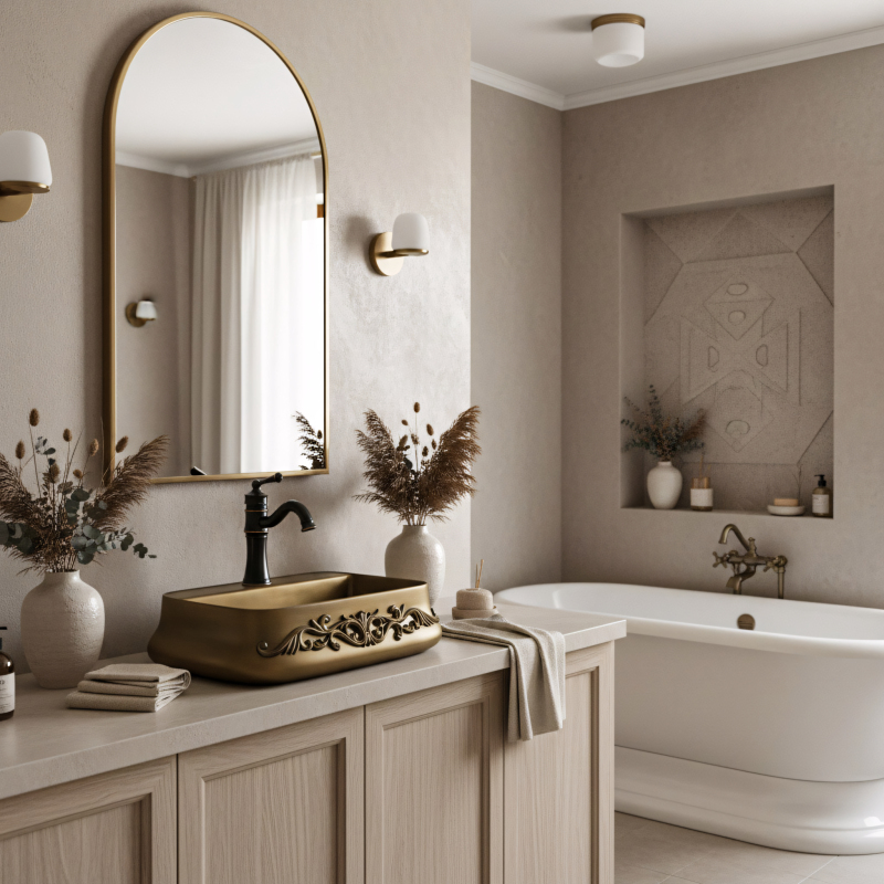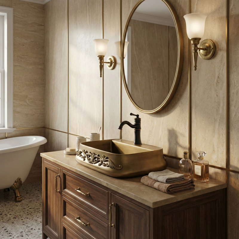 Zvoľ keramické umývadlo na dosku Rea Castel, pokiaľ hľadáš výrazný, klasický akcent do svojej kúpeľne. Tento model je skvelou voľbou pre milovníkov retro, vintage a rustikálneho štýlu – spája funkčný tvar s mimoriadne efektným, bohatým zdobením. Výnimočné zdobenie (reliéf) – čelo umývadla zdobí vystúpený florálny ornament. Je to detail, ktorý okamžite upúta pozornosť a stane sa hlavným dekoratívnym prvkom, dodávajúcim elegantný, remeselný charakter. Povrch v odtieni starej mosadze – keramický povrch získal jedinečnú farbu patinovanej hnedej. Tento zámerný vizuálny efekt skvele podčiarkuje vintage štýl a dodáva celej forme ušľachtilosť. Polička s otvorom pre batériu – model Castel má integrovanú poličku s továrni pripraveným otvorom. Umožňuje pohodlnú montáž stojančekovej batérie priamo na umývadlo, chráni dosku pred cákanci a uľahčuje každodenné upratovanie. Odolná sanitárna keramika - umývadlo je vyrobené z klasickej, pevnej keramiky. Zaručuje jednoduchú údržbu, hladký vnútorný povrch a odolnosť proti zmene farby. Montáž na dosku - inštalácia priamo na skrinku alebo dosku umožní plne vyniknúť zdobenému plášťu aj plynulo tvarovaným hranám umývadla. Umývadlo Rea Castel je výrazný detail, ktorý dokáže úplne zmeniť charakter interiéru. Jeho bohatá ornamentika a teplá farebnosť sa skvele hodí do kúpeľní v klasickom, „zámockom“ či eklektickom štýle a vytvára súdržný a štýlový priestor.