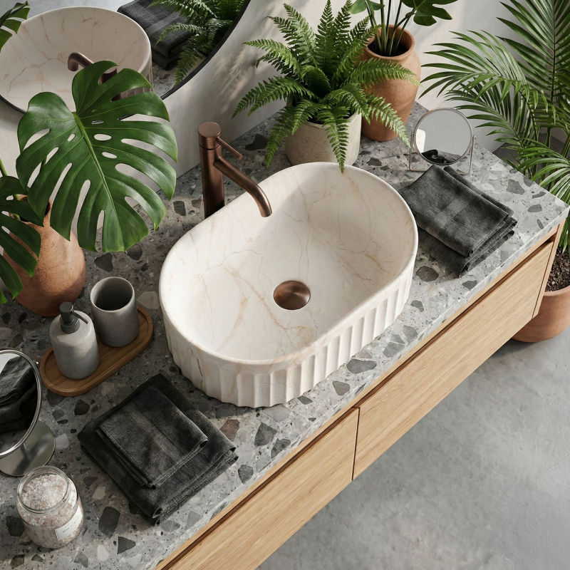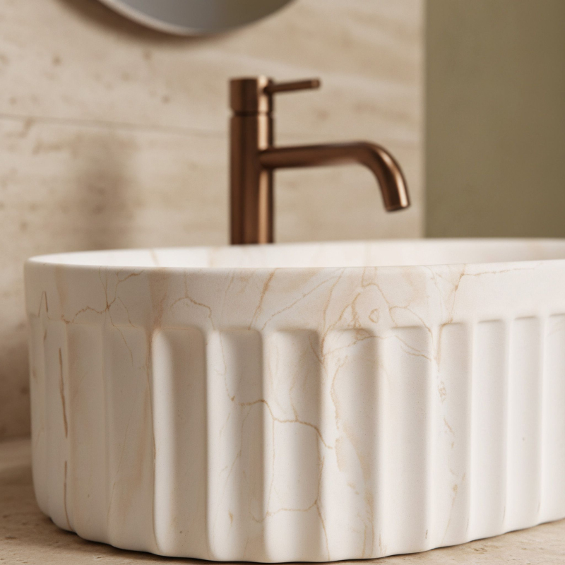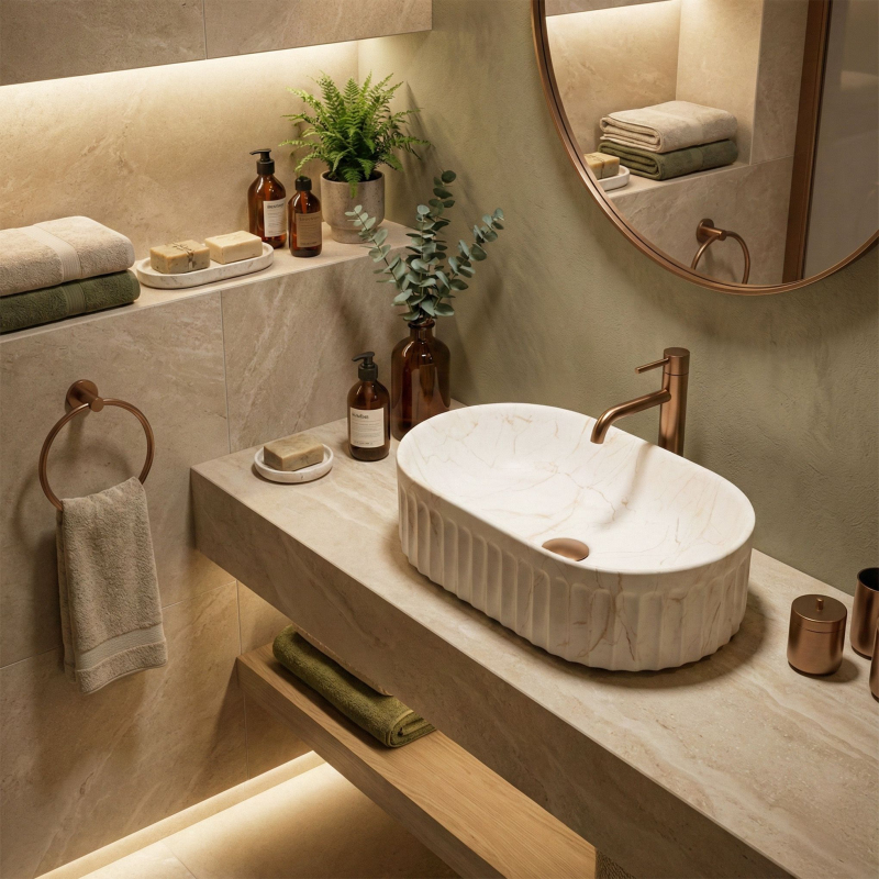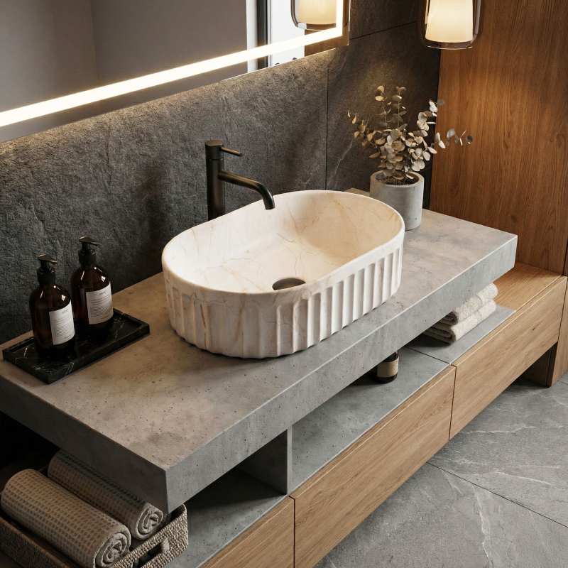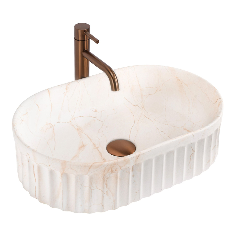 Objavte jedinečný dizajn a funkčnosť vďaka umývadlu na dosku Georgia. Tento model spája osvedčenú, odolnú keramiku s najnovšími interiérovými trendmi. Vyniká charakteristickou ryhovanou štruktúrou vonkajšej časti a jemným matným povrchom so vzorom kameňa, ktorý dodá umývacej zóne moderný a výrazný charakter. Ryhovaná štruktúra – vonkajší povrch misy má zvislé drážky (ryhovanie). Ide o veľmi trendy detail, ktorý narúša hladké plochy, opticky odľahčuje tvar a skvele ladí s ďalšími ryhovanými prvkami v kúpeľni, napríklad s čelami nábytku. Matný povrch s motívom kameňa – umývadlo zaujme vzorom imitujúcim prírodný mramor s jemným hrdzavým žilkovaním. Matný povrch je nielen estetický, ale aj praktický pre každodenné používanie. Odolná sanitárna keramika – model je vyrobený z vysoko kvalitného materiálu, ktorý sa vyznačuje vysokou odolnosťou proti poškriabaniu a poškodeniu, čo zaručuje stály vzhľad po dlhé roky. Montáž na dosku – umývadlo je určené na inštaláciu priamo na dosku alebo skrinku. Toto riešenie zvyšuje komfort používania a umožňuje získať ďalšie miesto na kozmetiku okolo misy. Ergonomický oválny tvar – oblý tvar bez ostrých hrán uľahčuje odtok vody a každodenné čistenie je rýchle a bezproblémové. Umývadlo na dosku Georgia je skvelou voľbou pre tých, ktorí hľadajú originálne, ale praktické vybavenie. Ryhovaný dizajn a matný kamenný vzor tvoria harmonický celok, ktorý bude výrazným prvkom každej modernej kúpeľne.