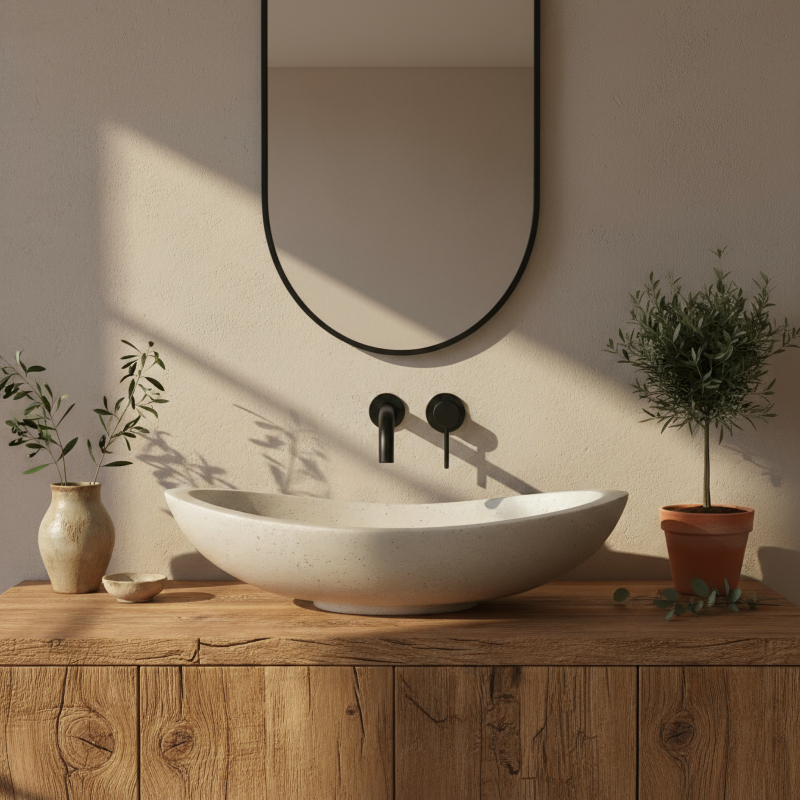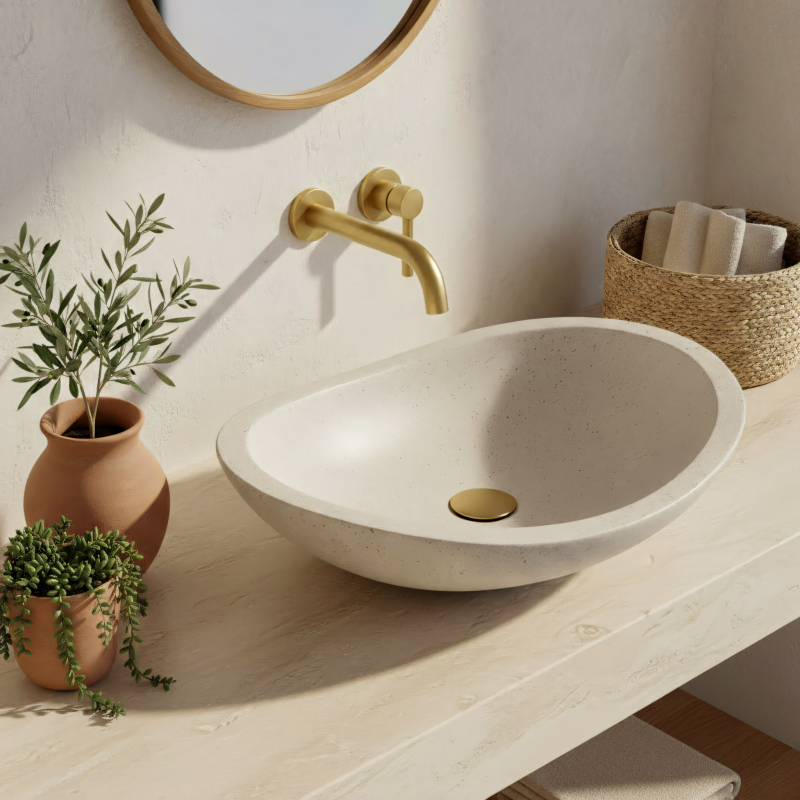 Chcete dodať kúpeľni štýlový, moderný prvok? Zoznámte sa s umývadlom na dosku Rea Leona z materiálu Artificial Stone. Tento pokročilý kompozit – zmes prírodného kameniva a živíc – spája vzhľad prírodného kameňa s výnimočnou odolnosťou. Elegantný oválny tvar a jedinečná škvrnitá štruktúra dodajú interiéru súčasný charakter. Materiál: Artificial Stone (kompozitný kameň) – špeciálna zmes pre mimoriadnu pevnosť a trvanlivosť. bráni množeniu baktérií.Vzhľad prírodného kameňa - jedinečné "korenisté-solené" zrnenie skvele zapadne do moderných kúpeľní.Nástavná (na dosku) montáž - určené pre inštaláciu na dosku či skrinku, s veľkou flexibilitou pri návrhu.Minimalistický dizajn - bez otvoru pre batériu a bez prepadu; pre nástenné alebo vysoké stojančekové batérie. Umývadlo Rea Leona je skvelou voľbou pre milovníkov originálneho dizajnu – ponúka krásny vzhľad, jednoduchú údržbu a vysokú odolnosť.