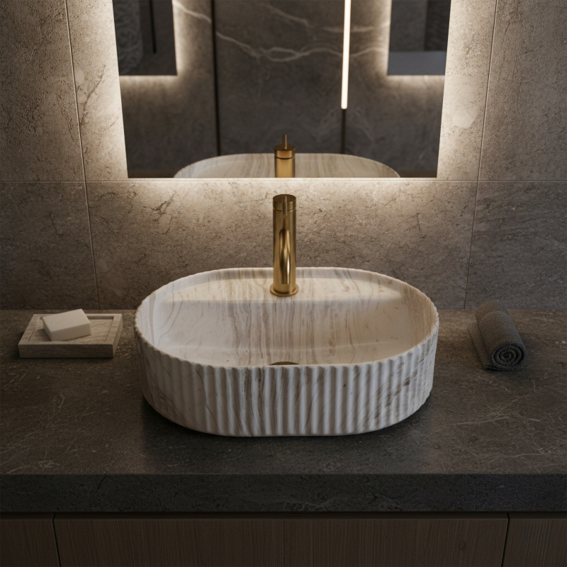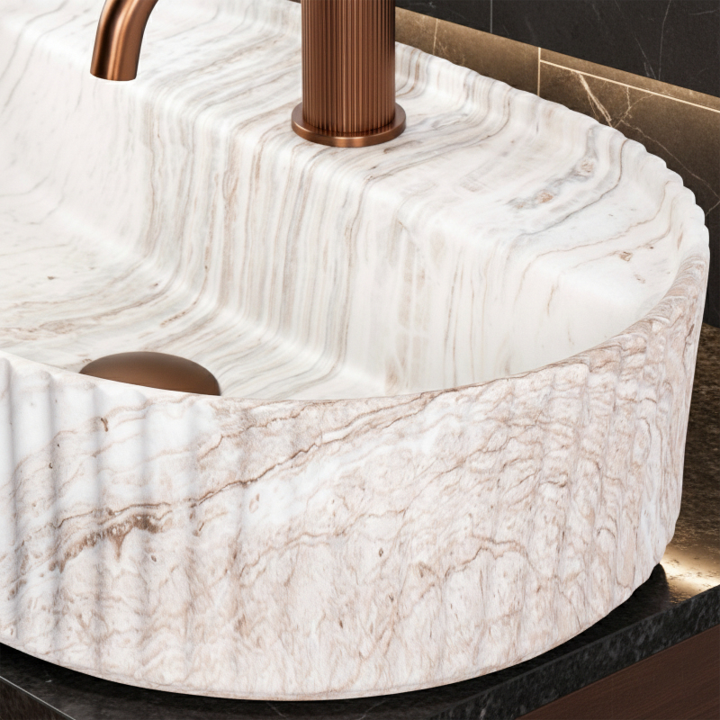 Umývadlo na dosku Rea Marcela 50 vo variante Kallisto je ideálnou voľbou pre kúpeľne, kde sa počíta premyslený detail a svetlý, elegantný akcent s efektom prírodného kameňa – tentoraz vo výraznejšom, žilkovanom prevedení. Krémovo biely základ dopĺňajú teplé béžovo-karamelové ťahy, ktoré sa skladajú do mäkkých vrstiev a dodávajú priestoru útulnosť aj prémiový charakter. Táto farebnosť skvele ladí s drevom, svetlými doskami, pieskovo tónovanými spekanými materiálmi aj s kontrastnou armatúrou v čiernej, grafitovej alebo medenej farbe. Tvar upúta pozornosť typickým zvislým ryhovaním na vonkajšej stene, ktoré podčiarkuje dizajnový charakter modelu a robí z umývadla prepracovaný dekoratívny prvok. Vnútri zostáva misa hladká a komfortne tvarovaná, čo uľahčuje každodenné používanie aj údržbu. Sanitárna keramika ponúka príjemné, ušľachtilé vyhotovenie a vzor Kallisto - s prirodzenými tonálnymi prechodmi a jemným žilkovaním - vytvára dojem hĺbky a jedinečnej kresby, ktorá krásne pracuje so svetlom.