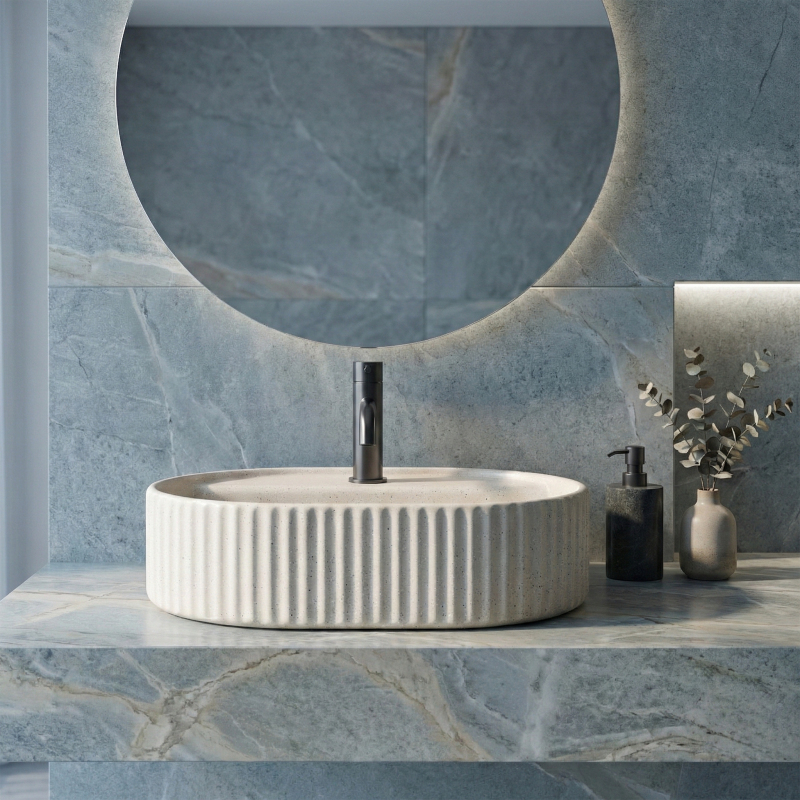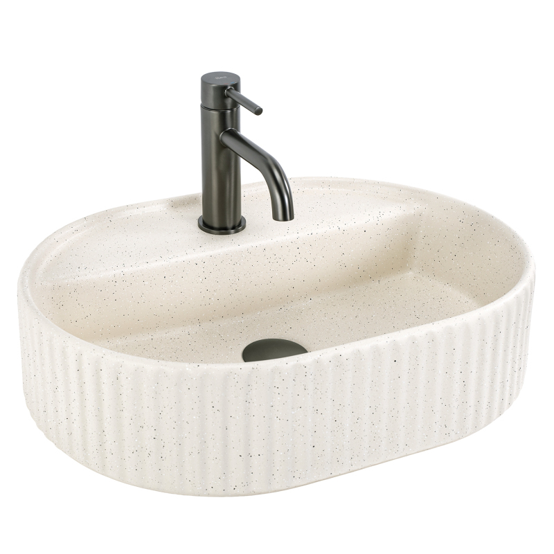 Umývadlo na dosku Rea Marcela 50 vo variante Vanilla je ideálnou voľbou do kúpeľní, kde záleží na prepracovanom detaile a pokojnej, elegantnej farebnosti. Teplý odtieň lomené biele priestor opticky odľahčí a prináša „jemný“ dojem čistoty, zároveň sa skvele kombinuje s kamennými doskami, drevom aj čiernymi či grafitovými batériami. Vďaka tomu sa hodí ako do moderných prémiových interiérov, tak do štýlu soft loft alebo modern classic. Tvar zaujme výrazným zvislým rebrovaním na vonkajšej stene, ktoré podčiarkuje dizajnový charakter a robí z umývadla dekoratívny prvok. Ďalšou výhodou je decentná bodkovaná štruktúra viditeľná na povrchu – dodáva povrchu hĺbku, prirodzený „kamenný“ efekt a celkovo veľmi noblesný vzhľad. Oválna, pohodlne tvarovaná misa zaisťuje komfort pri každodennom používaní a matná povrchová úprava Vanilla pomáha udržať jednotný, moderný vzhľad umývadlovej zóny.