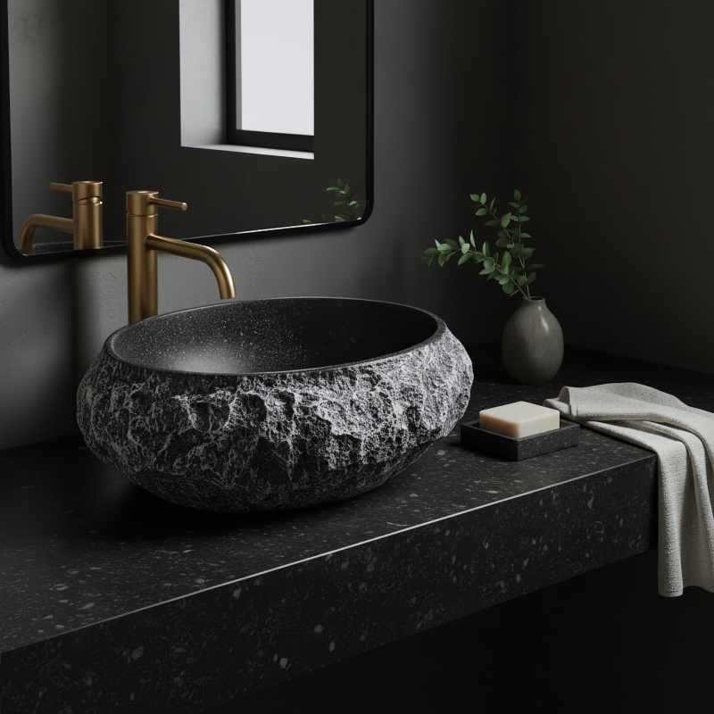 Zvýraznite umývadlovú zónu pomocou umývadla na dosku Rea Mika Garbo Black. Tento model s moderným charakterom zaujme zaujímavým kontrastom štruktúr. Tmavý vonkajší povrch s výraznou kameninovou textúrou sa tu spája s dokonale hladkým vnútrom. Celok je vyrobený z odolného kompozitu Artificial Stone. Štruktúra Garbo Black – vonkajší povrch misy má drsnejšiu, matnú úpravu s nepravidelnými svetlými odreninami imitujúcimi prírodný kameň. Dodáva výrobku surový, industriálny štýl. Materiál Artificial Stone – moderný kompozit zaisťuje pevnosť a odolnosť, zároveň je ľahší a na dotyk „teplejší“ ako tradičný kameň. Hladké vnútro – vnútorná časť je leštená a hladká, čo uľahčuje čistenie a zvyšuje komfort používania, a zároveň kontrastuje so surovým plášťom. aj vlhkosti a zaisťuje bezchybný vzhľad po dlhé roky. Montáž na dosku - umývadlo je určené na inštaláciu na dosku alebo skrinku, aby vynikla jeho dekoratívna forma. Umývadlo Rea Mika Garbo je skvelou voľbou do kúpeľní v štýle loft a modern. Spája atraktívny kameninový design s plnou funkčnosťou modernej sanitárnej keramiky a tvorí výrazný akcent interiéru.