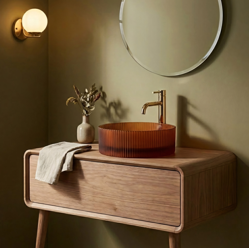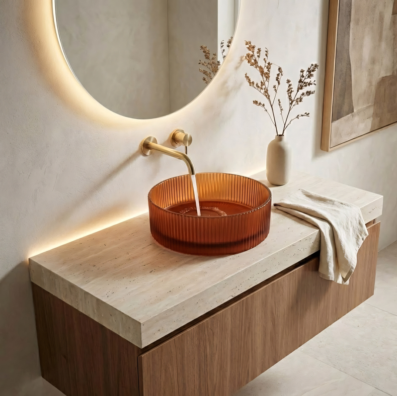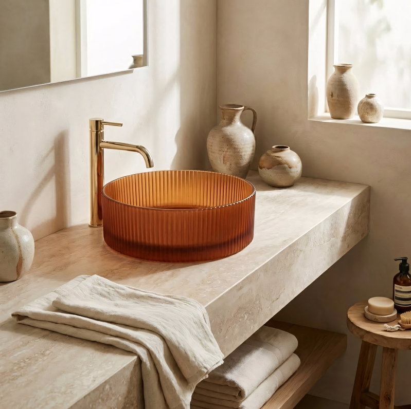 Vneste do svojej kúpeľne výrazný akcent vďaka umývadlu na dosku Rea Suri. Tento jedinečný model vyniká ryflovanou štruktúrou a teplou farebnosťou dymovo jantárovo hnedej. Je vyrobený z vysoko kvalitného tvrdeného skla a spája jemnosť formy s mimoriadnou odolnosťou pre každodenné používanie. Ryflovaná štruktúra – zvislé drážky na vonkajšej strane misy jej dodávajú unikátny vzhľad a odkazujú na klasický design. akcent. Matné prevedenie - saténový povrch je estetický a praktický pri každodennom používaní. Montáž na dosku - umožňuje inštaláciu na skrinku alebo pracovnú dosku a zvýrazňuje celý tvar umývadla. Univerzálne využitie - geometrická forma a farebnosť sa hodí do vintage, boho i moderných interiérov. Sklenené umývadlo Reai. Matné, ryflované sklo v jantárovom odtieni je pevná a estetická voľba, ktorá skvele doplní umývadlovú zónu a dodá jej jednotný charakter – či už zariaďujete kúpeľňu v retro štýle, alebo moderne.