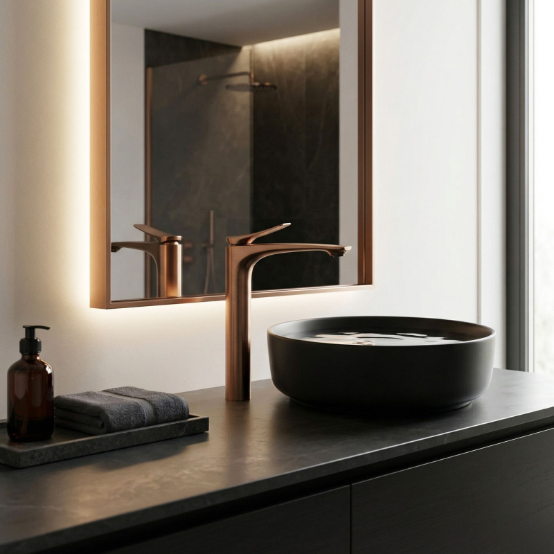 Vysoká umývadlová batéria Vision vo farbe brúsenej medi je elegantnou voľbou do moderných a luxusných umývadlových zón. Štíhly, vysoký tvar a jemne profilovaná línia výtoku jej dodávajú ľahkosť, zatiaľ čo ušľachtilé prevedenie v odtieni brúsenej medi vnáša do interiéru teplo a vycibrený charakter. farbe brúsenej medi – pôsobivý teplý odtieň s jemne brúsenou štruktúrou krásne podčiarkuje moderný dizajn batérie a skvele sa kombinuje so svetlým kameňom, keramikou, drevom aj tmavšími, luxusnými interiérovými akcentmi.PVD povrchová úprava – moderná technológia nanášania povlaku hĺbku farby aj elegantný vzhľad armatúry. Robustné telo – odolná konštrukcia zaisťuje stabilitu, odolnosť pri každodennom používaní a estetický vzhľad po dlhú dobu. Keramická kartuša – zodpovedá za plynulú a presnú reguláciu teploty a prúdu vody, čo sa premieta do komfortu a spoľahlivého fungovania armatúry. charakter, ideálny pre elegantné prémiové kúpeľne. Voľbou vysokej umývadlovej batérie Vision Brúsená Meď získate spojenie štýlu, funkčnosti a nadčasovej elegancie. Ide o výnimočný prvok vybavenia, ktorý dokonale podčiarkne charakter umývadla na dosku a dodá celej aranžácii luxusné zavŕšenie.