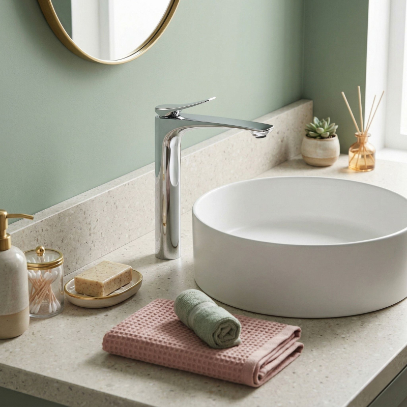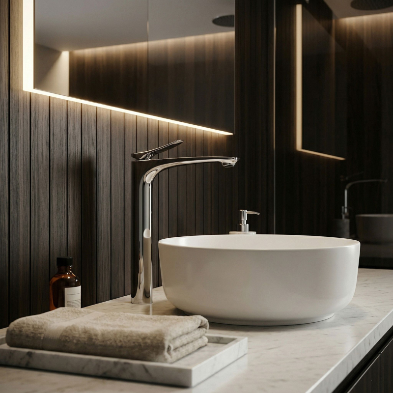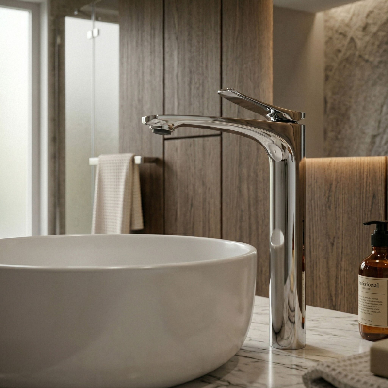 Vysoká umývadlová batéria Vision vo farbe chróm je elegantnou voľbou do moderných a luxusných kúpeľní. Štíhly, vysoký tvar a jemne profilovaná línia výtoku jej dodávajú ľahkosť, zatiaľ čo nadčasové chrómované prevedenie krásne podčiarkuje čistotu formy a vnáša do interiéru svieži, moderný charakter. lesklý, hladký povrch dodáva armatúre nadčasový vzhľad a skvele sa kombinuje ako so svetlou keramikou a kameňom, tak s modernými kúpeľňovými aranžmánmi. každodennom používaní a estetický vzhľad po dlhú dobu. Keramická kartuša – zodpovedá za plynulú a presnú reguláciu teploty a prúdu vody, čo sa premieta do komfortu a spoľahlivého fungovania armatúry. získate spojenie štýlu, funkčnosti a nadčasovej elegancie. Ide o výnimočný prvok vybavenia, ktorý dokonale podčiarkne charakter umývadla na dosku a dodá celej aranžácii moderné, luxusné zavŕšenie.