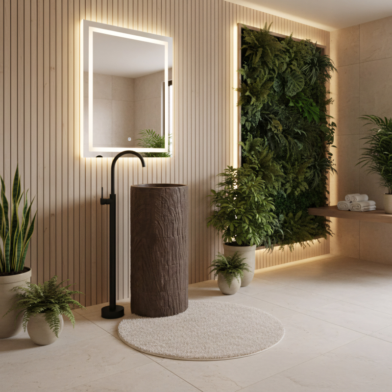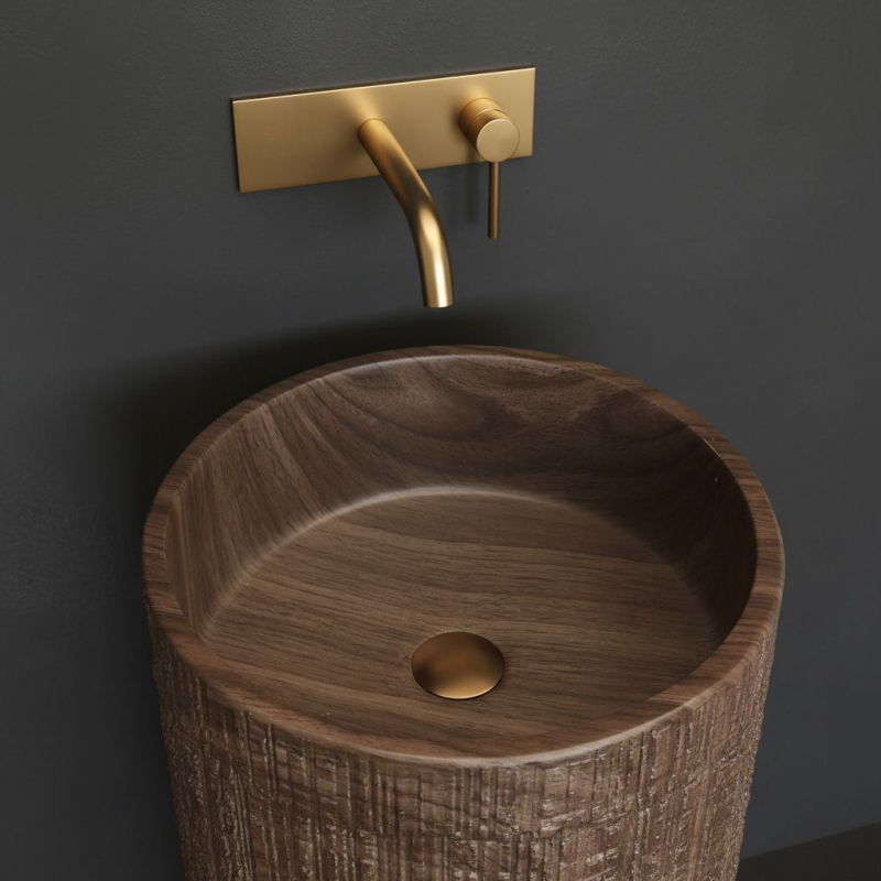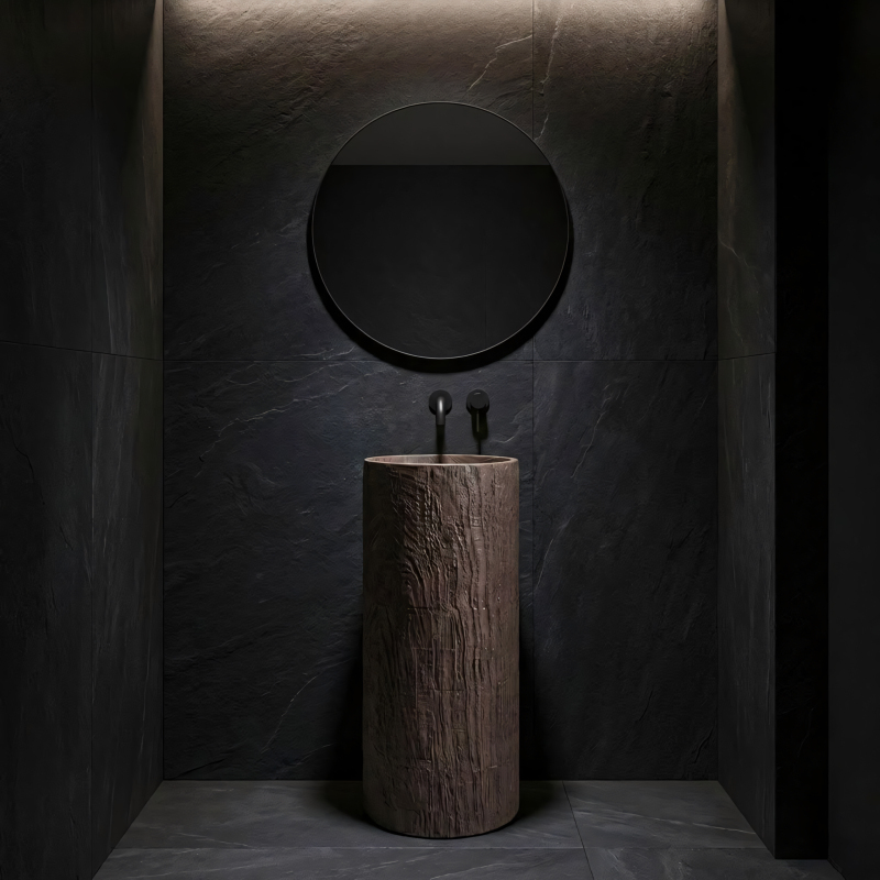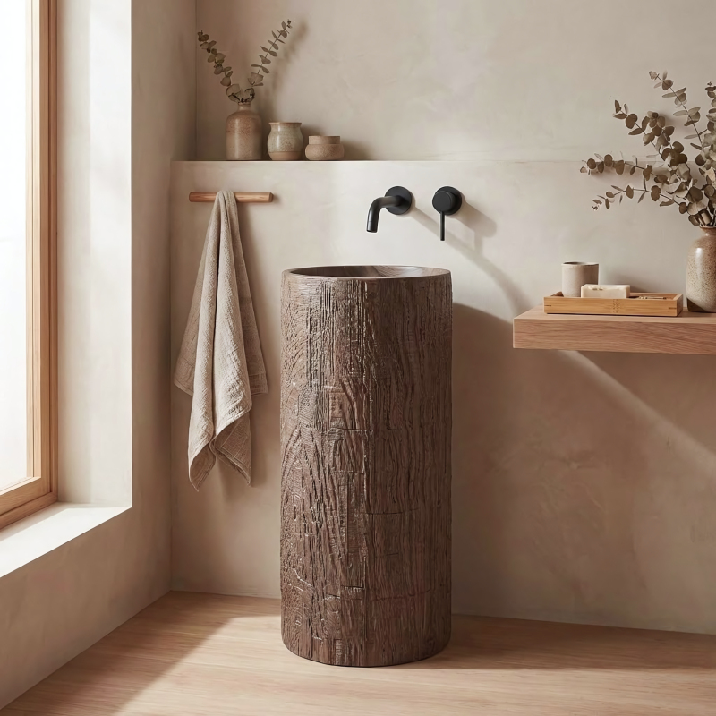 Zvoľte voľne stojace umývadlo Rea, ktoré predstavuje pôsobivé spojenie surového designu a modernej technológie. Tento monolitický model z odolného kompozitu Artificial Stone vyniká jedinečnou textúrou imitujúcou prírodný kmeň stromu. Do kúpeľne vnesie organickú atmosféru a zároveň zachová plnú odolnosť a funkčnosť syntetických materiálov. Materiál Artificial Stone - vysoko kvalitný umelý kameň (kompozit) s výnimočnou trvanlivosťou, odolnosťou proti mechanickému poškodeniu a dokonale hladkým vnútorným povrchom. Imitácia prírodného dreva nezameniteľný rustikálny vzhľad. Voľne stojaca konštrukcia – jednoliaty celok inštalovaný priamo na podlahu tvorí výrazný centrálny prvok kúpeľne. Revízny otvor – na zadnej strane stĺpu je praktický otvor, ktorý umožňuje jednoduchú montáž sifónu a uľahčuje servisný prístup k inštalácii. Odolnosť voči vlhkosti – na rozdiel od pravého dreva je použitý kompozit úplne odolný voči vode a vlhkosti. umývadlo Rea je skvelou voľbou pre milovníkov štýlu eco, loft aj spa – praktická a designová úžitková „socha“ do vašej kúpeľne.
