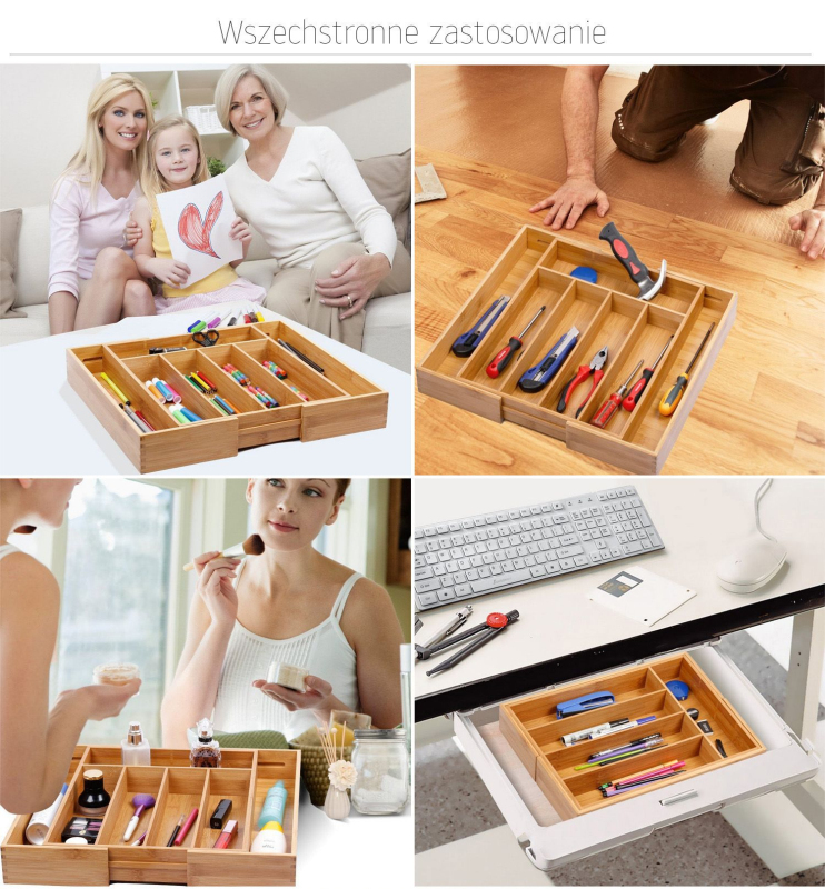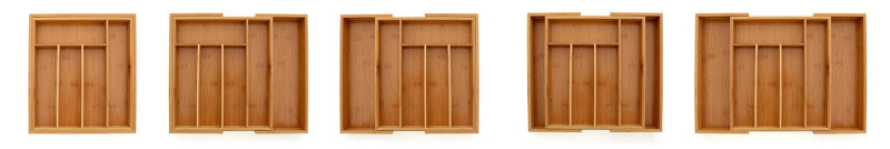 Predstavujeme vám položku, ktorá vyrieši problém s neporiadkom v zásuvkách. Náš organizér vám pomôže udržať v čistote zásuvky v kuchyni, kancelárii, pracovni, detskej izbe, dielni alebo obývačke. V zloženom stave meria organizér na šírku 28 cm a má 5 priehradiek rôznych veľkostí, pričom jeho najväčšou výhodou je, že ho možno rozšíriť až na 45 cm a získať tak 2 veľké priehradky. Vďaka nastaviteľnej šírke môžete náš organizér prispôsobiť akejkoľvek veľkosti zásuvky.