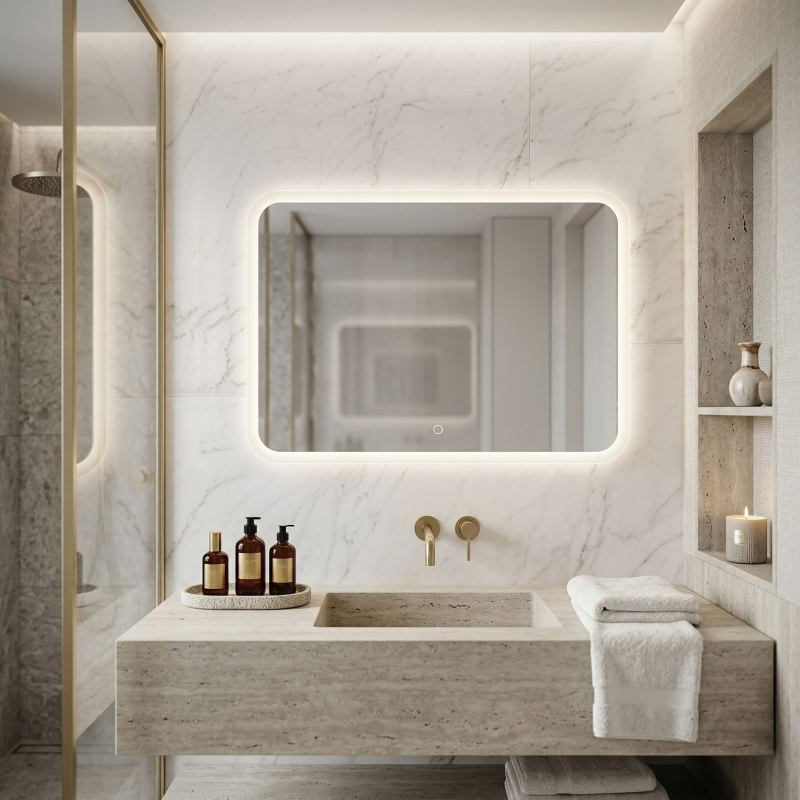 Premeňte interiér svojej kúpeľne a získajte každodenný komfort vďaka nášmu nástennému LED zrkadlu Rea 80×60 cm s mliečnym rámčekom. Je to ideálne spojenie moderného štýlu a inovatívnej funkčnosti, ktoré nadchne každého člena domácnosti. Toto obdĺžnikové zrkadlo s jemne zaoblenými rohmi, vyrobené z kvalitných materiálov, nielen opticky zväčší priestor, ale tiež zaistí dokonalé osvetlenie každý deň. Obdĺžnikový tvar so zaoblenými rohmi sa skvele hodí k najnovším trendom, zjemňuje ostré línie armatúr a dodáva interiéru modernú eleganciu. Mliečny LED rám mimoriadne tenká plocha s hrúbkou 3 mm zaručuje minimalistický a jemný vzhľad na stene. LED osvetlenie s neutrálnou farbou svetla zaisťuje prirodzené podanie farieb, čo je veľmi užitočné pri rannom líčení alebo presnom holení. Intuitívne dotykové tlačidlo s funkciou stmievania umožňuje rýchle zapnutie a plynulú reguláciu jasu, čím pomáha vytvoriť relaxačný kúpeľ. zaručuje bezproblémovú a rýchlu montáž a umožňuje okamžité používanie zrkadla bez úprav domácej elektroinštalácie. Kúpeľňové LED zrkadlo Rea je spoľahlivou voľbou pre tých, ktorí si cenia pohodlné používanie a premyslený dizajn. Vďaka pevnému spracovaniu a úspornej technológii si môžete byť istí, že vám bude slúžiť mnoho rokov.