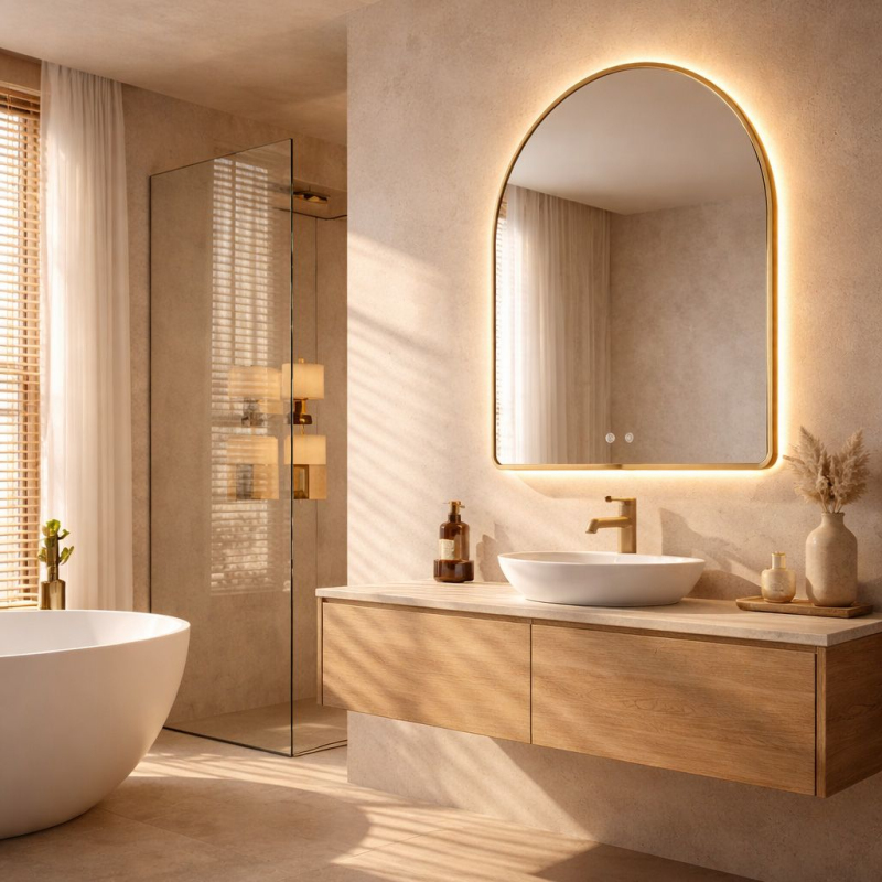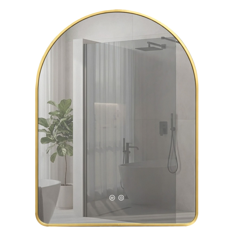 Kúpeľňové LED zrkadlo Camlot s rozmermi 80×60 cm je elegantnou kombináciou klasického tvaru oblúka s modernou technológiou osvetlenia. Výrazný zlatý rám s brúseným povrchom dodáva interiéru luxusný charakter a robí zo zrkadla ústredný dekoratívny bod každej štýlovej kúpeľne. v spodnej časti skla podčiarkuje prestížny vzhľad výrobku. Kartáčovaná štruktúra je matná a elegantná a dokonale maskuje drobné stopy používania. Teplá farba svetla s funkciou stmievania – integrované LED podsvietenie vyžaruje príjemné teplé svetlo, ktoré vytvára útulnú atmosféru. Intuitívny systém umožňuje plynulú reguláciu jasu a prispôsobenie intenzity žiary vašim potrebám. Systém Anti-Fog (Vykurovacia rohož) – funkcia vyhrievania skla účinne zabraňuje jeho zahmlievaniu a zaisťuje jasný odraz aj bezprostredne po horúcom kúpeli alebo sprche. Dotykové ovládanie – dve podsvietené tlačidlá umiestnené v spodnej časti dotykom. Pripravené na zapojenie – zrkadlo je vybavené káblom so zástrčkou, čo umožňuje rýchlu inštaláciu a zapojenie do štandardnej elektrickej zásuvky bez nutnosti úpravy elektroinštalácie. Výberom LED zrkadla Camlot 80×60 cm v zlatom ráme vsádzate na špičkovú estetiku a každodennú funkčnosť. Je to ideálna voľba pre kúpeľne v modernom štýle, glamour a art déco, kde záleží na každom detaile a vysokej kvalite spracovania.