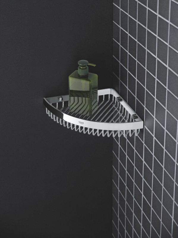 Vytvoriť zjednotený kúpeľňový interiér nebolo nikdy jednoduchšie. Stačí doň zahrnúť precízne spracované doplnky z radu GROHE Selection Cube, napríklad túto rohovú policu – ideálny spôsob, ako skladovať šampóny, sprchové gély alebo mydlo. Jeho minimalistický design a precízne spracovanie z tých najlepších materiálov zaručuje fantastický vzhľad v každej modernej kúpeľni. Samozrejmosťou je prítomnosť všetkých prémiových technológií GROHE, na ktoré ste zvyknutí. Odolný chrómový povrch GROHE StarLight zaručuje blyštivý vzhľad a ľahké čistenie.