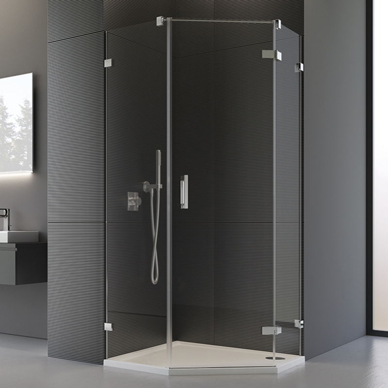 Sprchové dvere od spoločnosti SanSwiss (pre päťuholníkový sprchovací kút) spĺňajú vysoké nároky na dizajn a individuálne riešenie kúpeľne. Kvalitné materiály ako masívne chrómované pánty (na vnútornej strane zapustené) a kovanie, 8mm bezpečnostné sklo, designové madlo. Magnetické tesnenie, 5mm aluchrómová prahová lišta. Antiplaková úprava skla AQUAPERLE na jednoduché čistenie. Sprchové dvere sa otvárajú von. Ide o sprchové dvere pre päťuholník, ku ktorým je nutné objednať bočnú stenu pre päťuholník s vyrovnávacím profilom PUT51P alebo bočnú stenu pre päťuholník s L-kovaním PUT51.