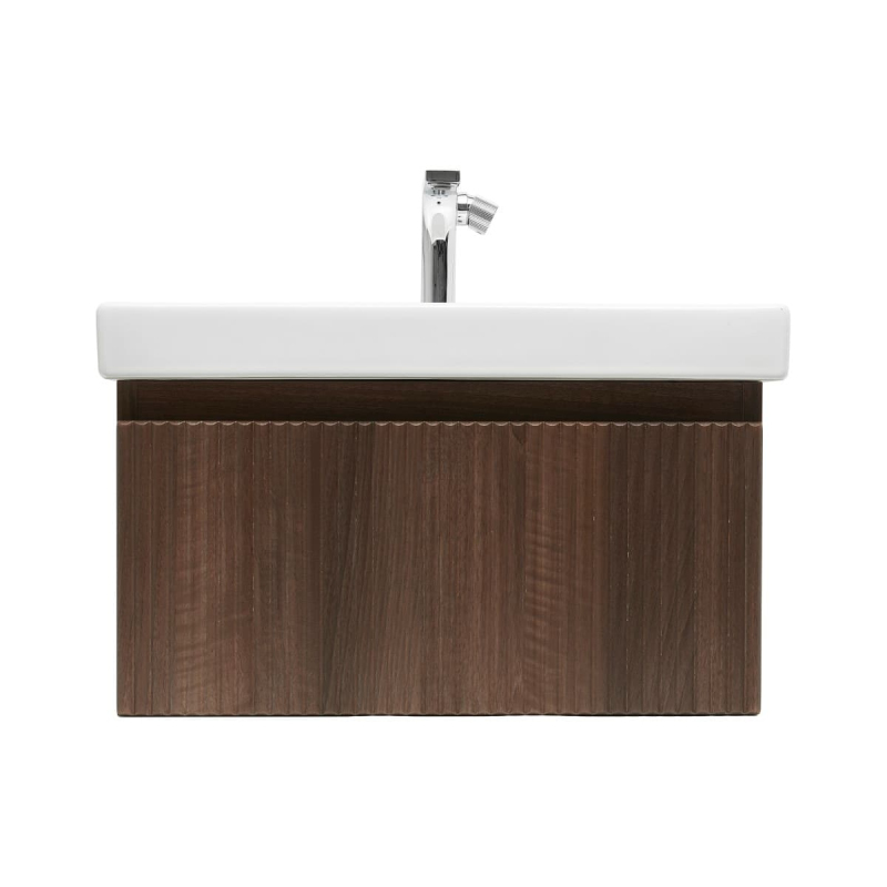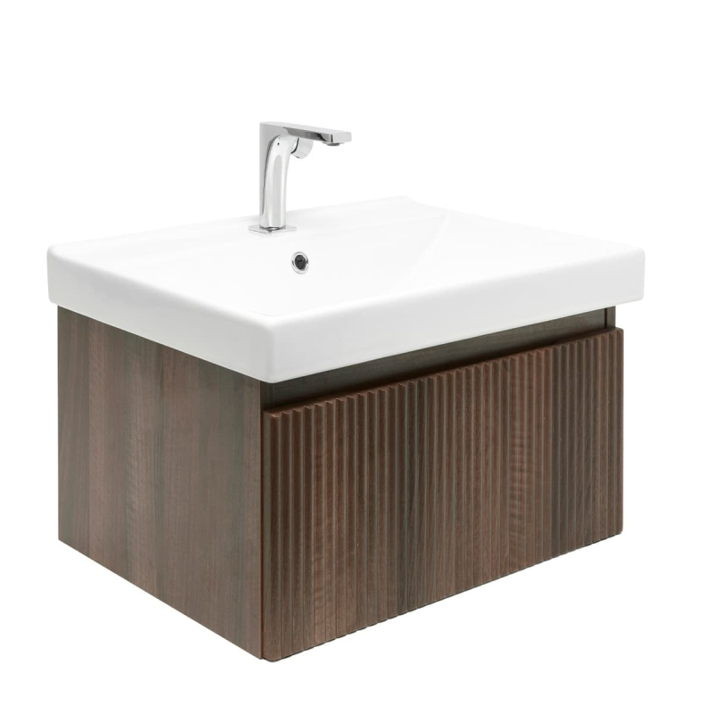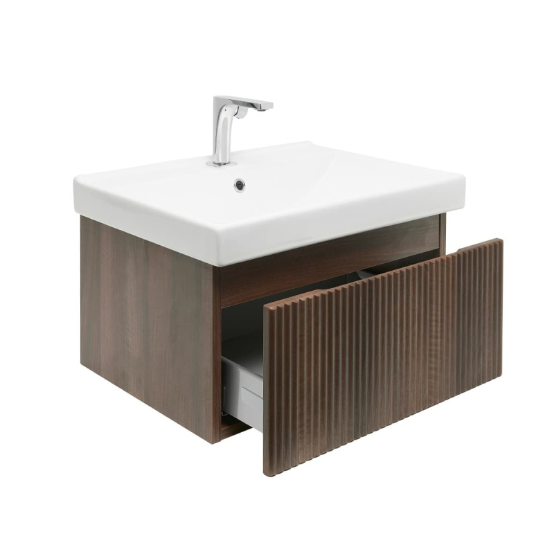 Závesná kúpeľňová skrinka s batériou a keramickým umývadlom v dekore orech s matným povrchom o rozmere 58x30x44,8 cm. Povrch v prevedení lamino.