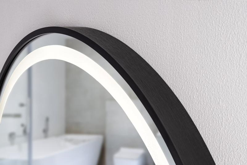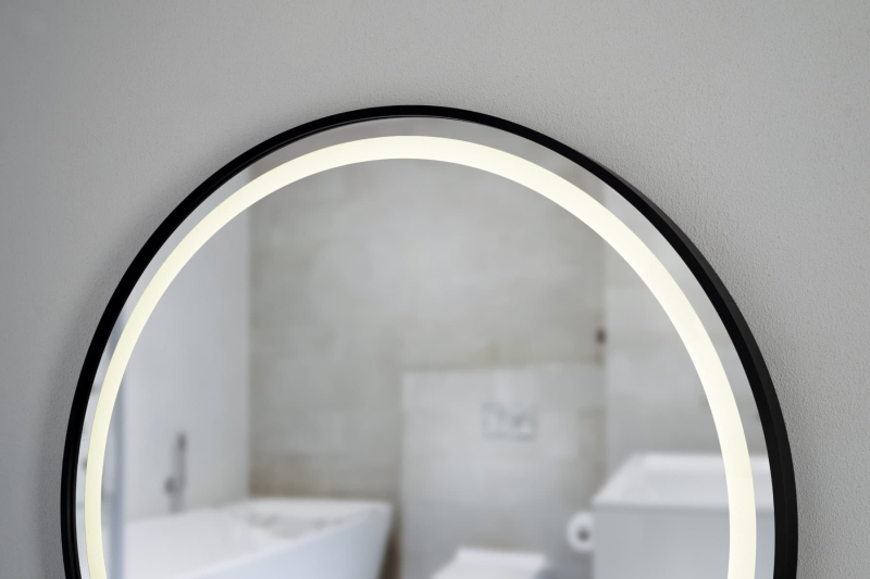 Okrúhle zrkadlo s LED osvetlením so senzorom s priemerom 70 cm. V čiernej farbe. Farebná teplota osvetlenia je 4 000 K (neutrálna biela). S krytím IP44, je chránené proti striekajúcej vode.