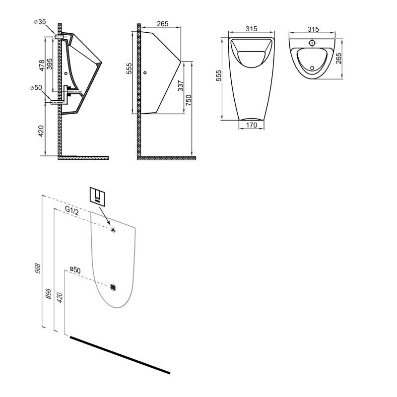 SCHWARN BLACK keramický urinál, zadný prívod, zadný odpad, čierna matná 201.701.6
