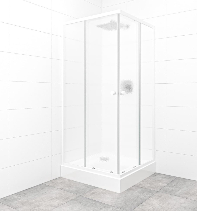 Sprchovací kút s vaničkou a farbou profilov biela, výplň je z nepriehľadného skla a je opatrená dekorom Chinchilla. Posuvný systém otvárania. Ľavá aj pravá orientácia.