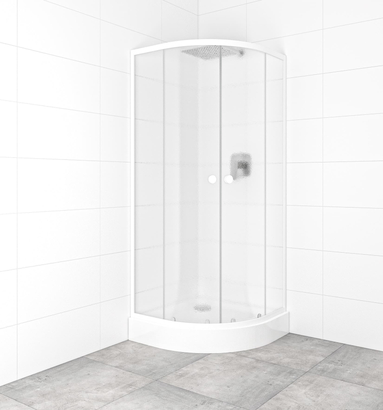 Sprchovací kút s vaničkou a farbou profilov biela, výplň je z nepriehľadného skla a je opatrená dekorom Chinchilla. Posuvný systém otvárania. Ľavá aj pravá orientácia.