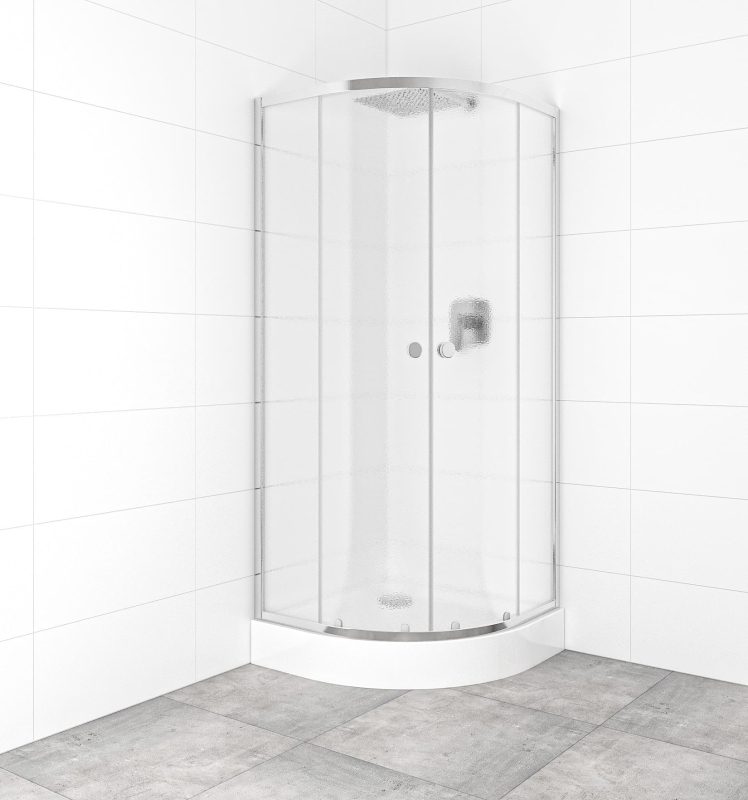 Sprchovací kút s vaničkou a farbou profilov v lesklom chróme, výplň je z nepriehľadného skla a je opatrená dekorom Chinchilla. Posuvný systém otvárania. Ľavá aj pravá orientácia.