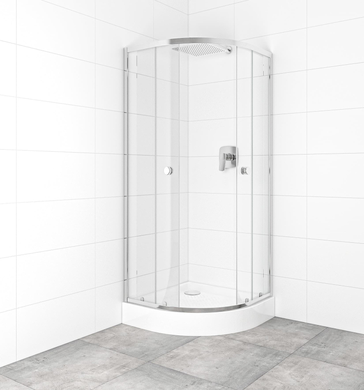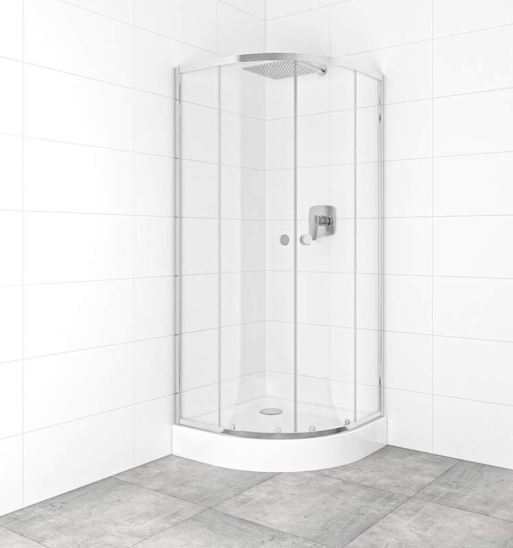Sprchovací kút s vaničkou a farbou profilov v lesklom chróme, výplň je z číreho skla bez dekoru. Posuvný systém otvárania. Ľavá aj pravá orientácia.