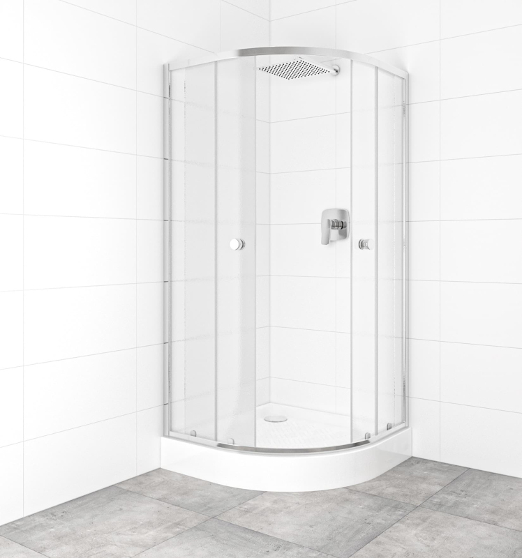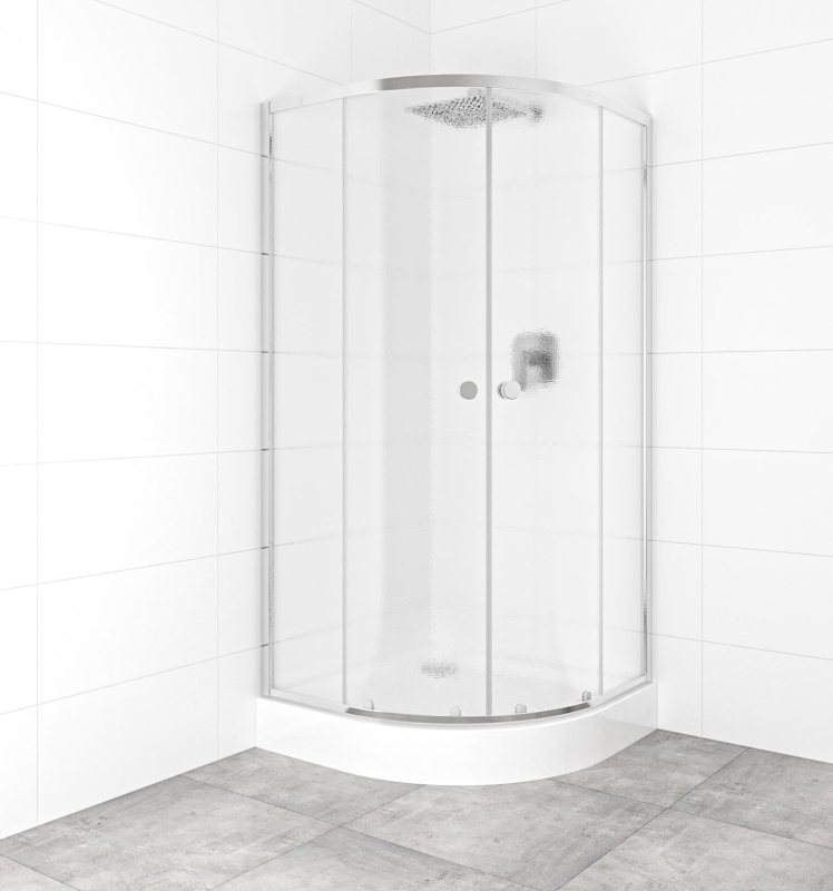 Sprchovací kút s vaničkou a farbou profilov v lesklom chróme, výplň je z nepriehľadného skla a je opatrená dekorom Chinchilla. Posuvný systém otvárania. Ľavá aj pravá orientácia.