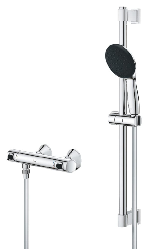 Termostatická nástenná sprchová batéria so sprchovacím setom v chrómovom prevedení. Rozteč batérie 150 mm. Vo farebnom prevedení lesk.