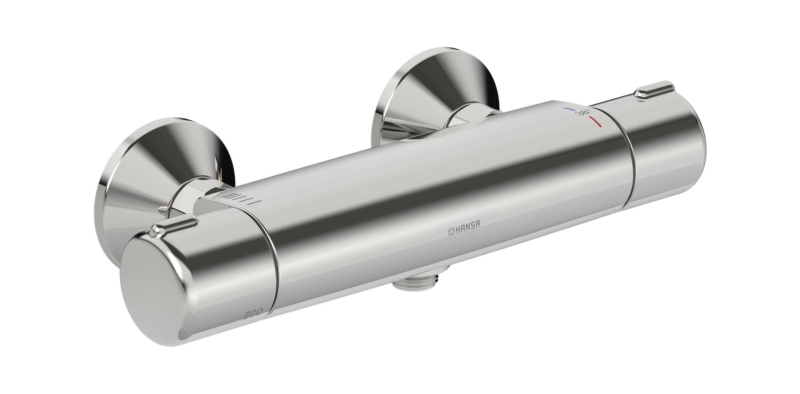 Termostatická nástenná sprchová batéria bez sprchového setu. V chrómovom prevedení. Prietok batérie je 11,4 litrov/minútu. Rozteč batérie 150 mm.