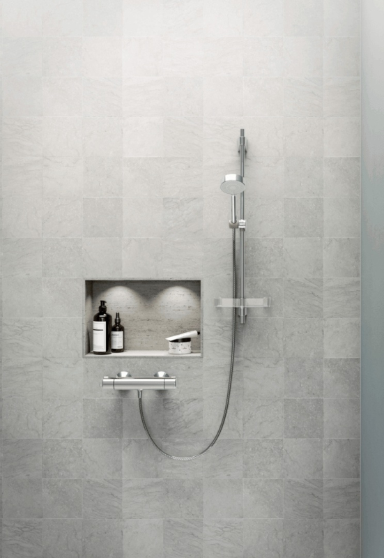 Termostatická nástenná sprchová batéria bez sprchového setu. Zamenené pripojenie studenej/teplej vody - pre prípad, keď je pripravený prívod teplej vody na pravej strane. V chrómovom prevedení. Prietok batérie je 11,4 litrov/minútu. Rozteč batérie 150 mm.