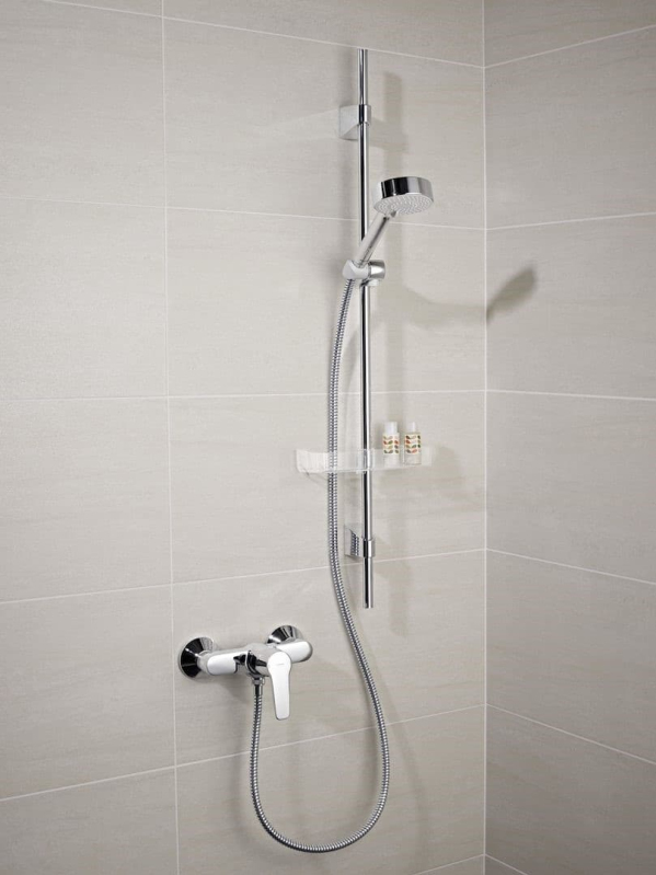 Páková nástenná sprchová batéria bez sprchového setu. V chrómovom prevedení. Prietok batérie je 16,8 litrov/minútu. Rozteč batérie 150 mm.