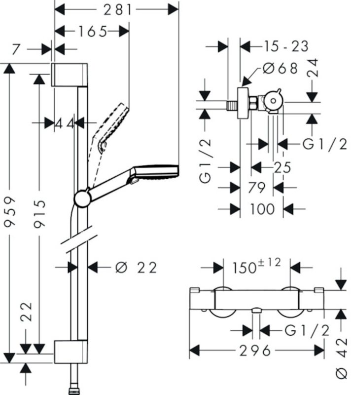 Termostatická nástenná sprchová batéria so sprchovacím setom. V prevedení biela a chróm. Prietok batérie je 14 litrov/minútu. Rozteč batérie 150 mm.