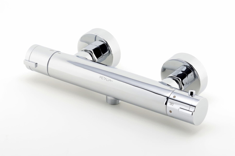 Termostatická nástenná sprchová batéria bez sprchového setu v chrómovom prevedení. Rozteč batérie 150 mm. Vo farebnom prevedení lesk.