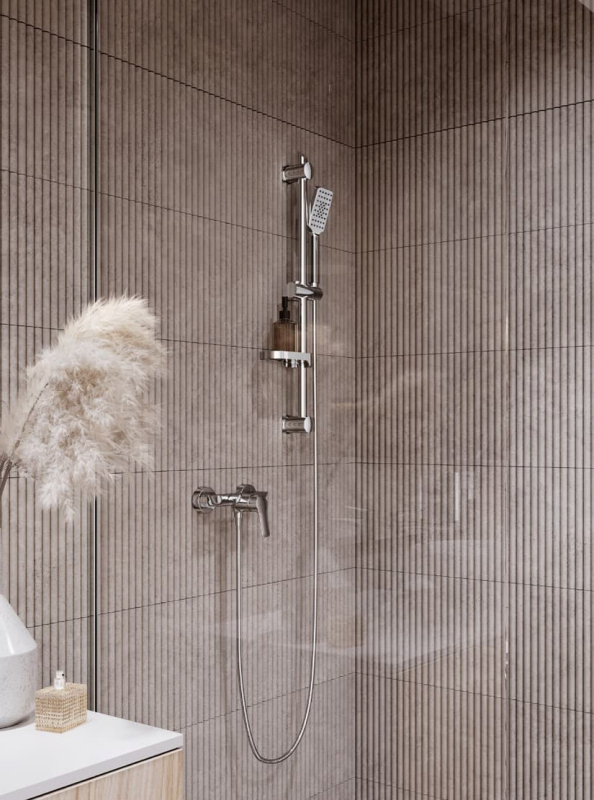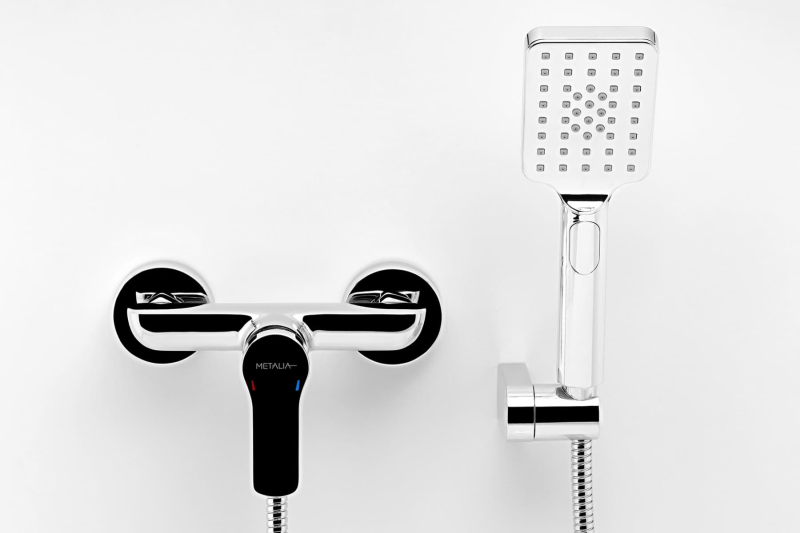 Páková nástenná sprchová batéria s vaňovým setom v chrómovom prevedení. Prietok batérie je 8 litrov/minútu. Rozteč batérie 150 mm. Vo farebnom prevedení lesk.