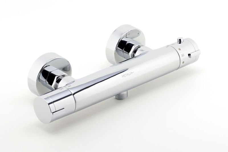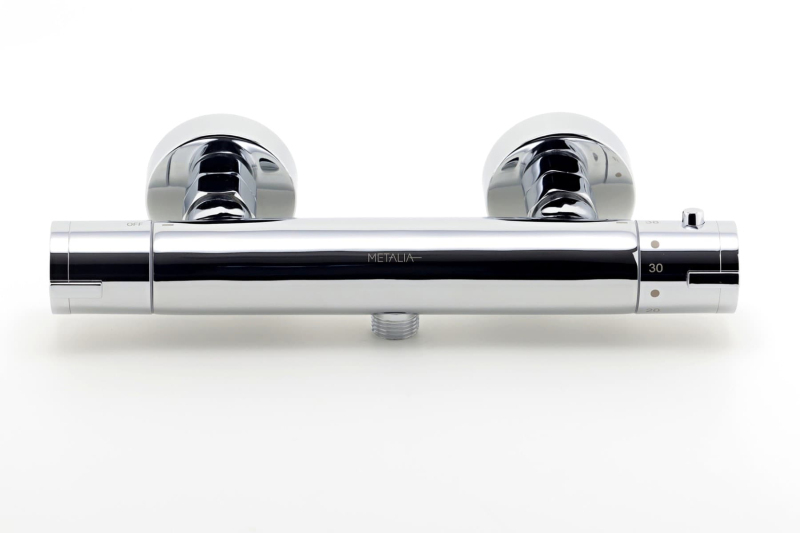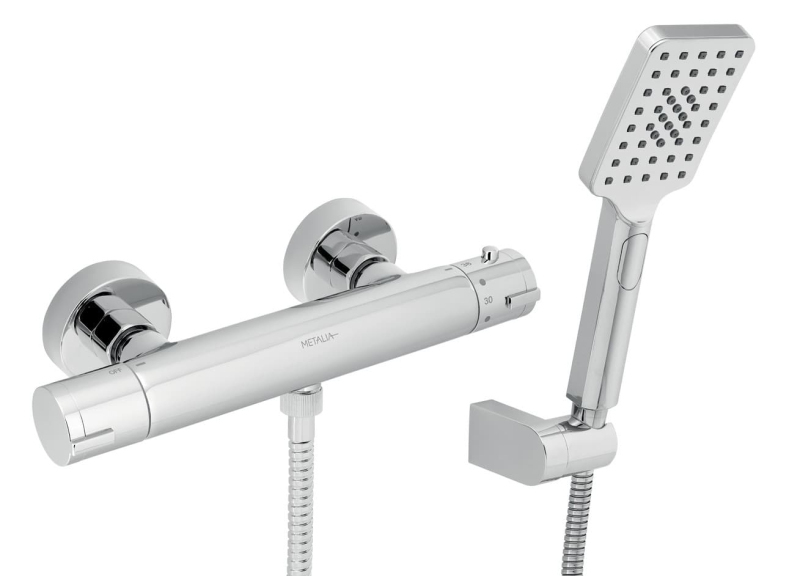 Termostatická nástenná sprchová batéria s vaňovým setom v chrómovom prevedení. Prietok batérie je 8 litrov/minútu. Rozteč batérie 150 mm. Vo farebnom prevedení lesk.
