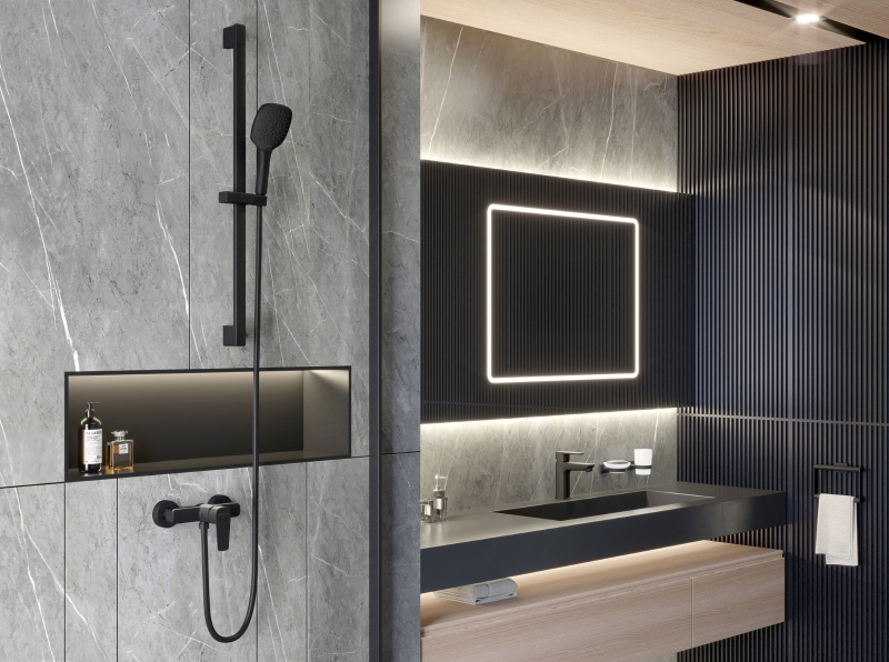 Páková nástenná sprchová batéria bez sprchového setu. V čiernej farbe. Rozteč batérie 150 mm. S matným povrchom.