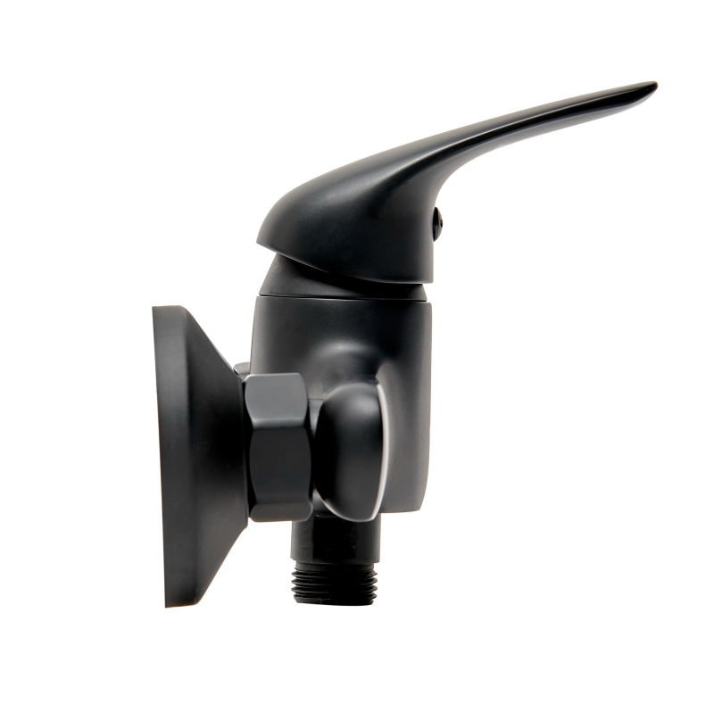 Páková nástenná sprchová batéria bez sprchového setu. V čiernej farbe. Rozteč batérie 150 mm. S matným povrchom.