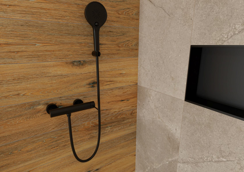Páková nástenná sprchová batéria bez sprchového setu. V okrúhlom dizajne vo farbe čierna matná. Rozteč batérie 150 mm. S matným povrchom