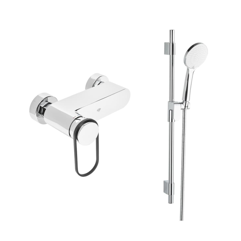 Páková nástenná sprchová batéria so sprchovacím setom v chrómovom prevedení. Rozteč batérie 150 mm. Vo farebnom prevedení lesk.