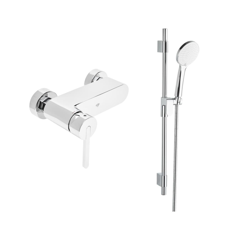 Páková nástenná sprchová batéria so sprchovacím setom v chrómovom prevedení. Rozteč batérie 150 mm. Vo farebnom prevedení lesk.