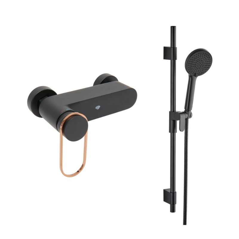 Páková nástenná sprchová batéria so sprchovacím setom vo farbe čierna matná. Rozteč batérie 150 mm. S matným povrchom.