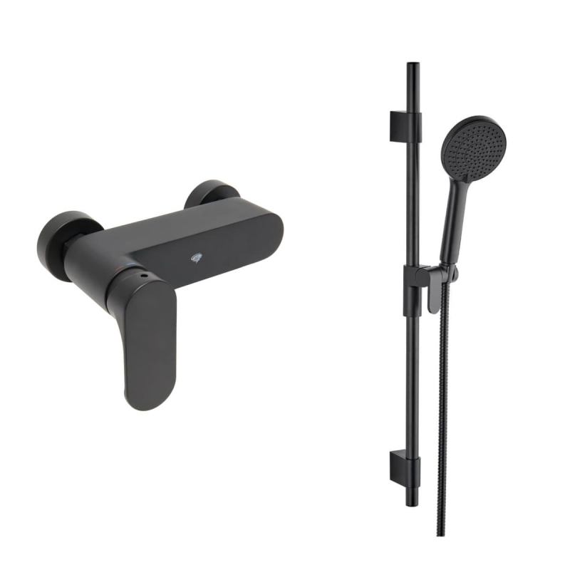 Páková nástenná sprchová batéria so sprchovacím setom vo farbe čierna matná. Rozteč batérie 150 mm. S matným povrchom.