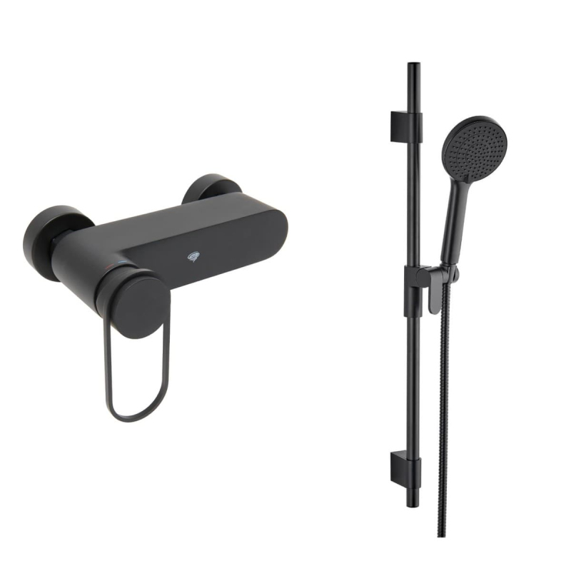 Páková nástenná sprchová batéria so sprchovacím setom vo farbe čierna matná. Rozteč batérie 150 mm. S matným povrchom.
