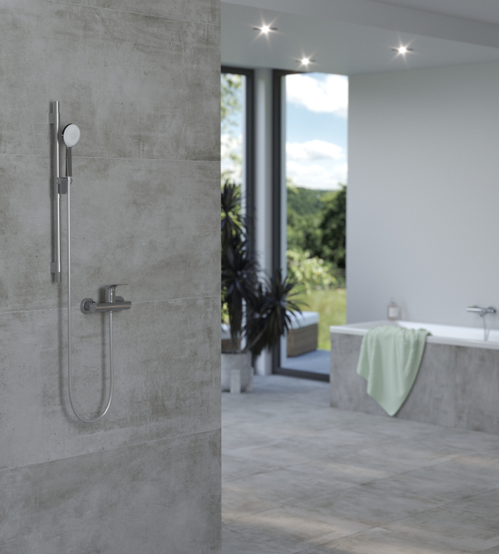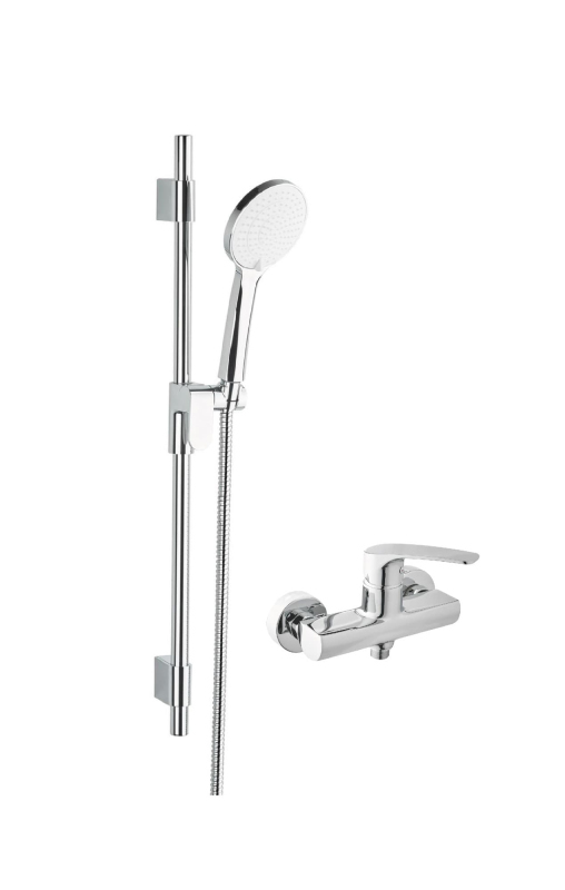 Páková nástenná sprchová batéria so sprchovacím setom v chrómovom prevedení. Rozteč batérie 150 mm. Vo farebnom prevedení lesk.