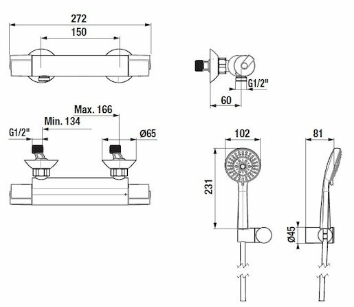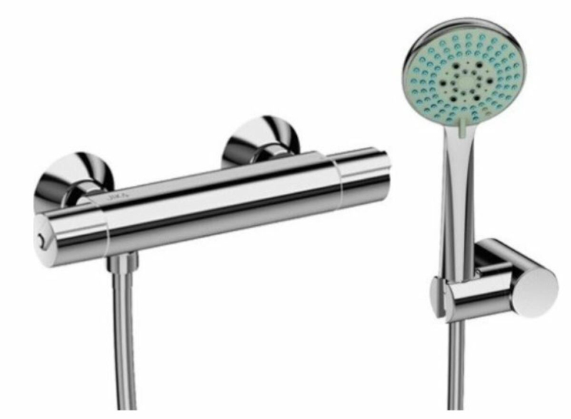 Termostatická nástěnná sprchová baterie se sprchovým setem. V oblém designu. V chromovém provedení. Rozteč baterie 150 mm.