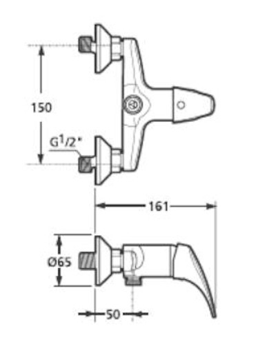 Páková nástěnná sprchová baterie bez sprchového setu. V chromovém provedení. Rozteč baterie 150 mm. Výška baterie je 16,1 cm.